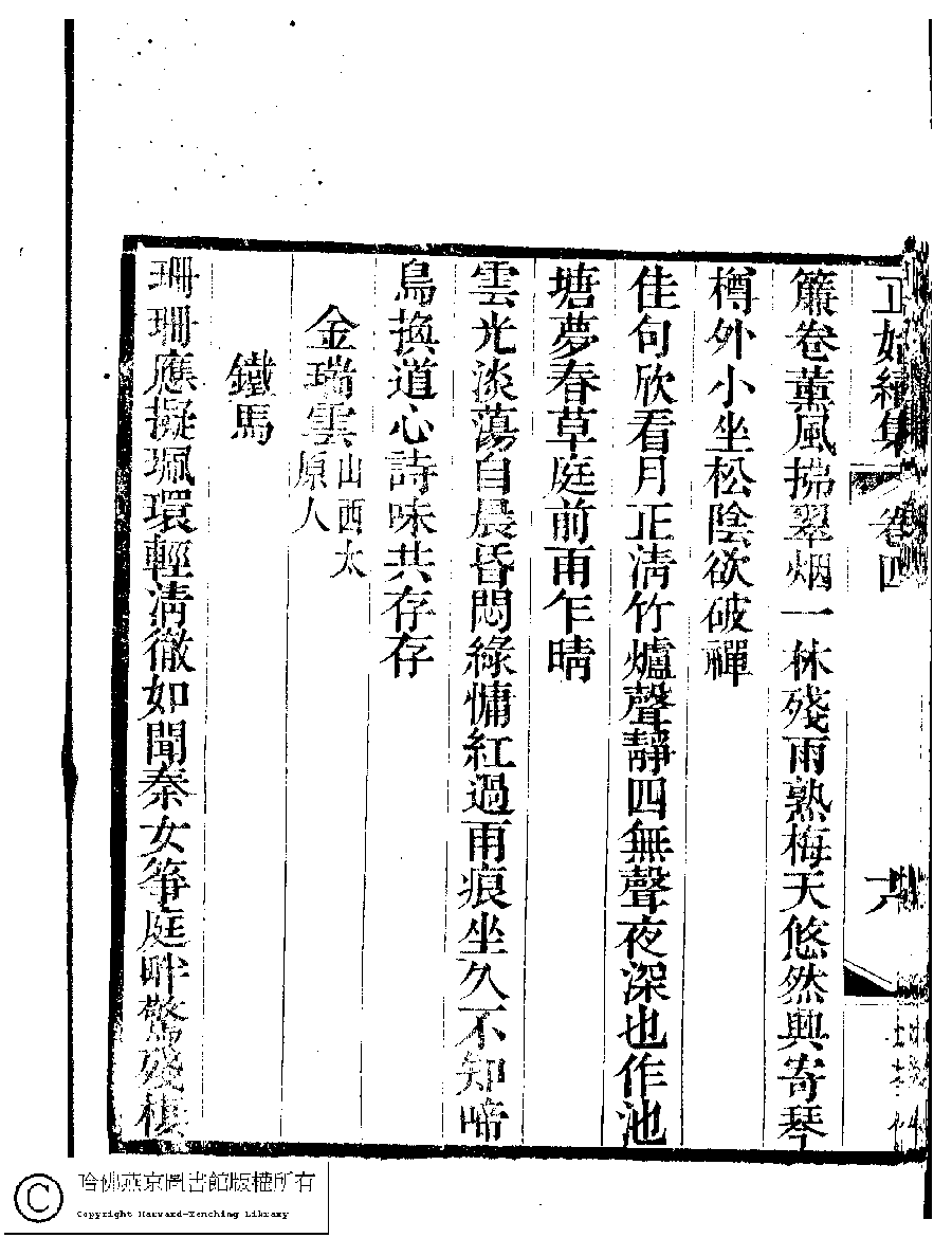 | (PRINT FRIENDLY VERSION) 國朝閨秀正始續集﹕十卷﹐附錄﹕一卷﹐補遺﹕一卷﹐輓詞﹕一卷(清惲珠輯)。清道光十六年(1836)紅香館刻本。 ![]() Page : 4.18b | click for larger image | 國朝閨秀正始續集﹕十卷﹐附錄﹕一卷﹐補遺﹕一卷﹐輓詞﹕一卷(清惲珠輯)。清道光十六年(1836)紅香館刻本。![]() Page : 4.18a | click for larger image | Back |