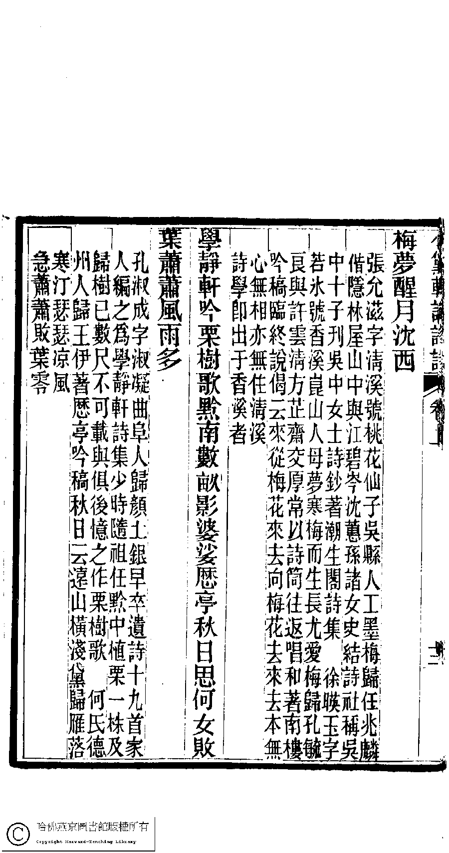 | (PRINT FRIENDLY VERSION) 陳孝女遺集﹕二卷﹔小黛軒論詩詩﹕二卷(清陳芸撰)。民國三年(1914)刻本 ![]() Page : 上.12b | click for larger image | Back |