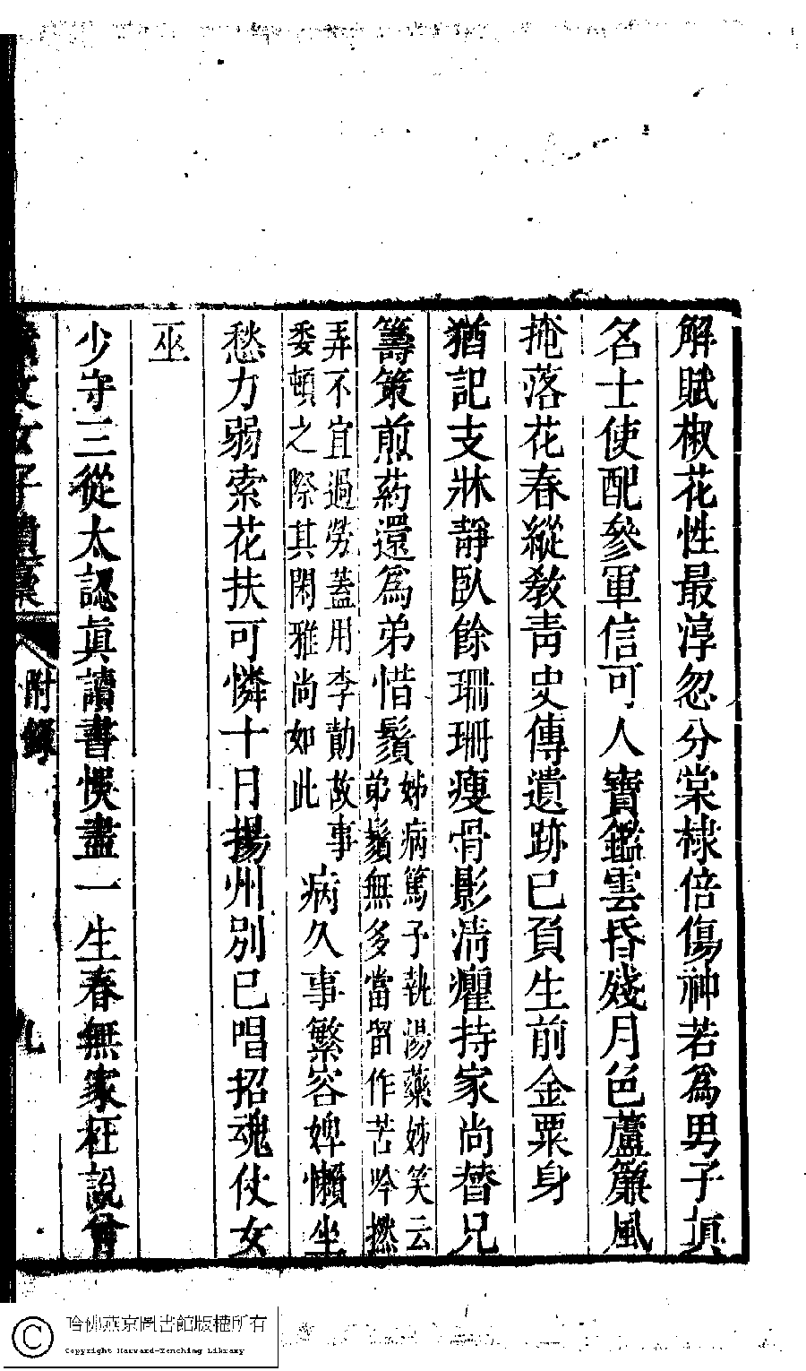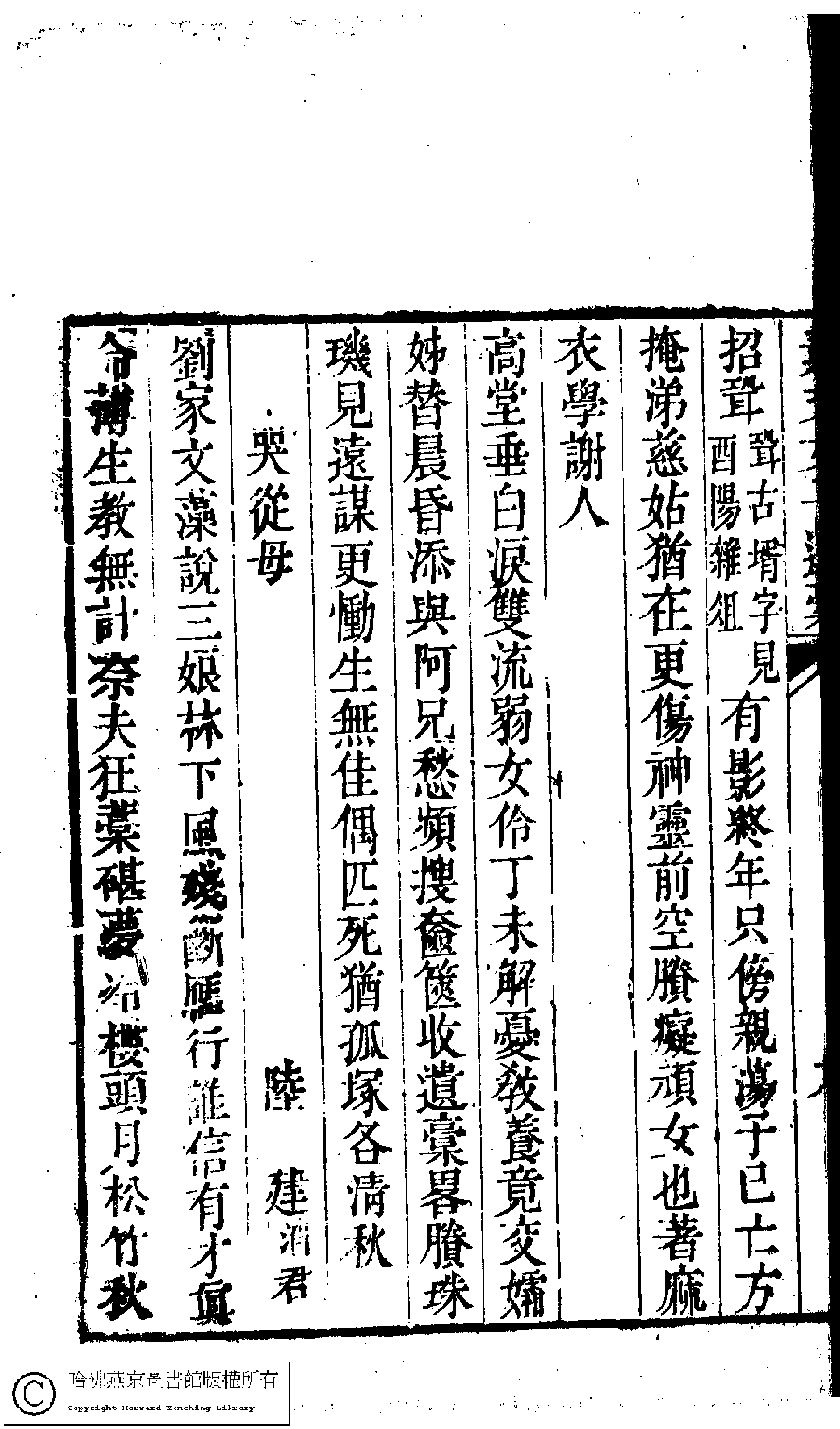 | (PRINT FRIENDLY VERSION) 素文女子遺稿(清袁機撰)。清嘉慶間(1796-1820)刻本。 ![]() Page : 9b | click for larger image | 素文女子遺稿(清袁機撰)。清嘉慶間(1796-1820)刻本。![]() Page : 9a | click for larger image | 素文女子遺稿(清袁機撰)。清嘉慶間(1796-1820)刻本。![]() Page : 8b | click for larger image | Back |