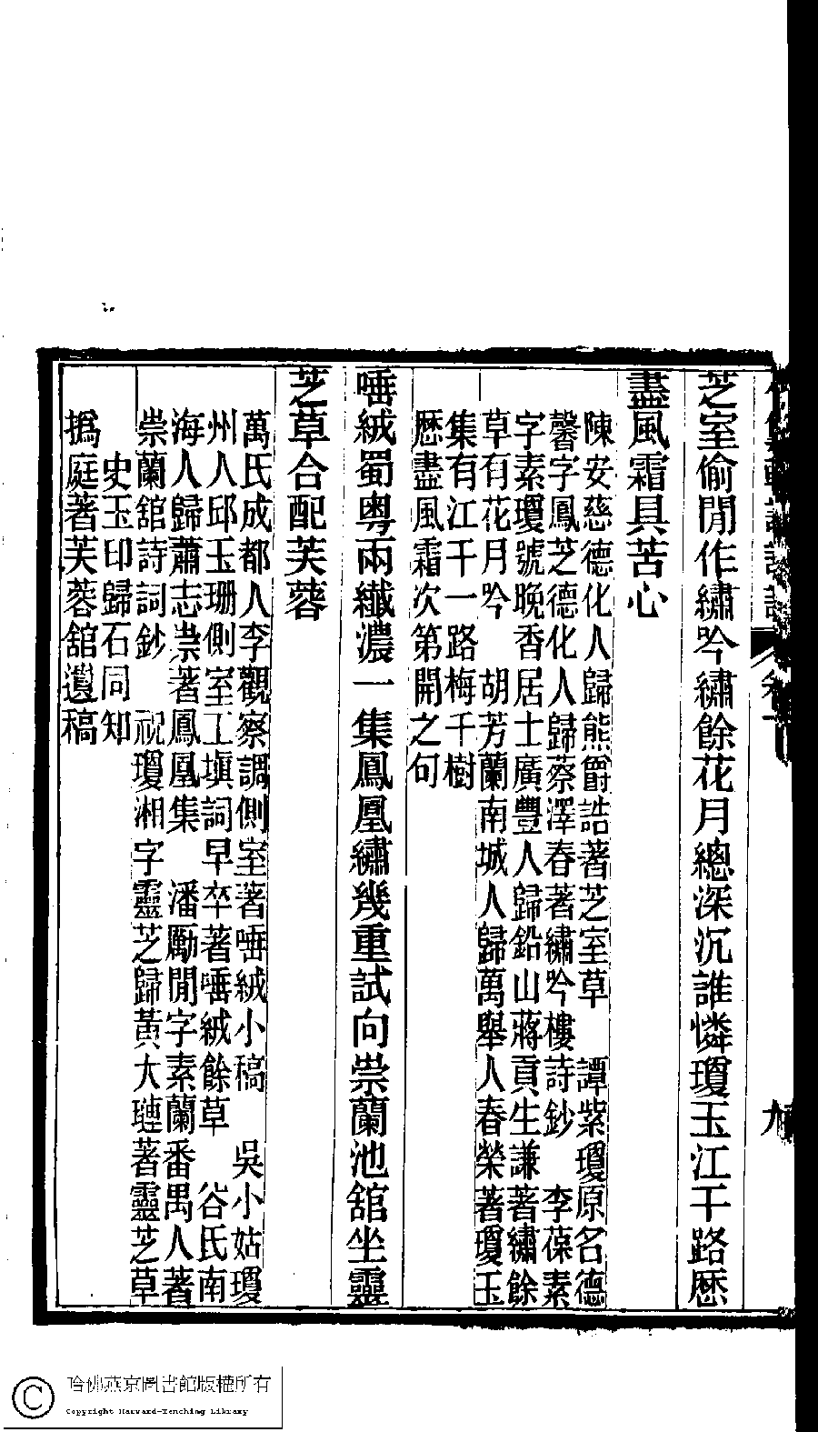 | (PRINT FRIENDLY VERSION) 陳孝女遺集﹕二卷﹔小黛軒論詩詩﹕二卷(清陳芸撰)。民國三年(1914)刻本 ![]() Page : 下.9b | click for larger image | Back |