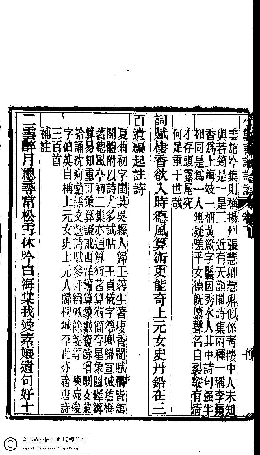 | (PRINT FRIENDLY VERSION) 陳孝女遺集﹕二卷﹔小黛軒論詩詩﹕二卷(清陳芸撰)。民國三年(1914)刻本 ![]() Page : 下.11a | click for larger image | 陳孝女遺集﹕二卷﹔小黛軒論詩詩﹕二卷(清陳芸撰)。民國三年(1914)刻本![]() Page : 下.10b | click for larger image | Back |