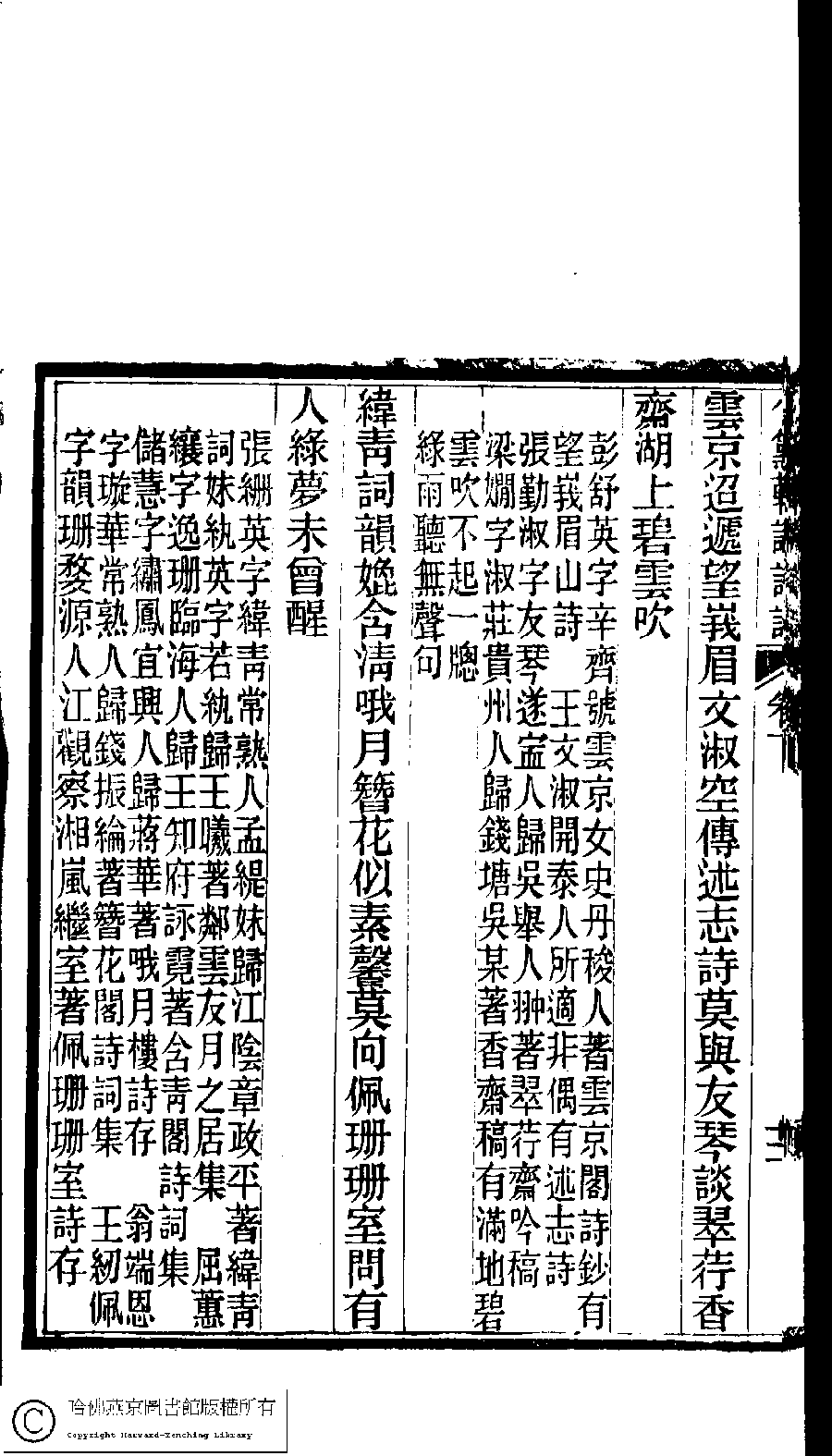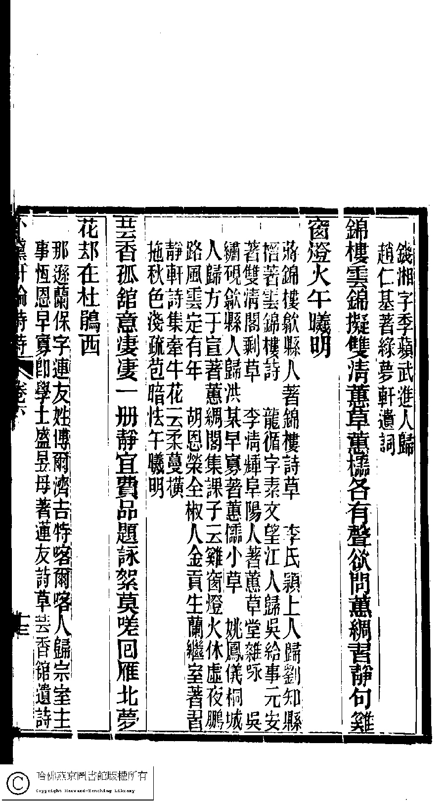 | (PRINT FRIENDLY VERSION) 陳孝女遺集﹕二卷﹔小黛軒論詩詩﹕二卷(清陳芸撰)。民國三年(1914)刻本 ![]() Page : 下.13a | click for larger image | 陳孝女遺集﹕二卷﹔小黛軒論詩詩﹕二卷(清陳芸撰)。民國三年(1914)刻本![]() Page : 下.12b | click for larger image | Back |