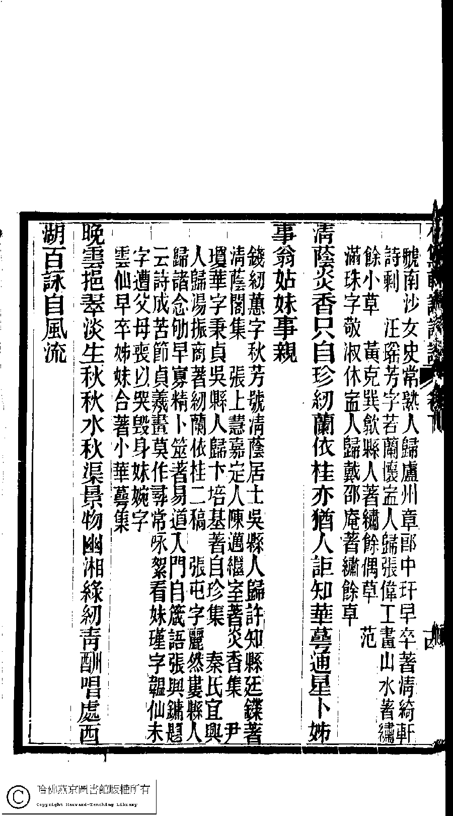 | (PRINT FRIENDLY VERSION) 陳孝女遺集﹕二卷﹔小黛軒論詩詩﹕二卷(清陳芸撰)。民國三年(1914)刻本 ![]() Page : 下.14b | click for larger image | Back |