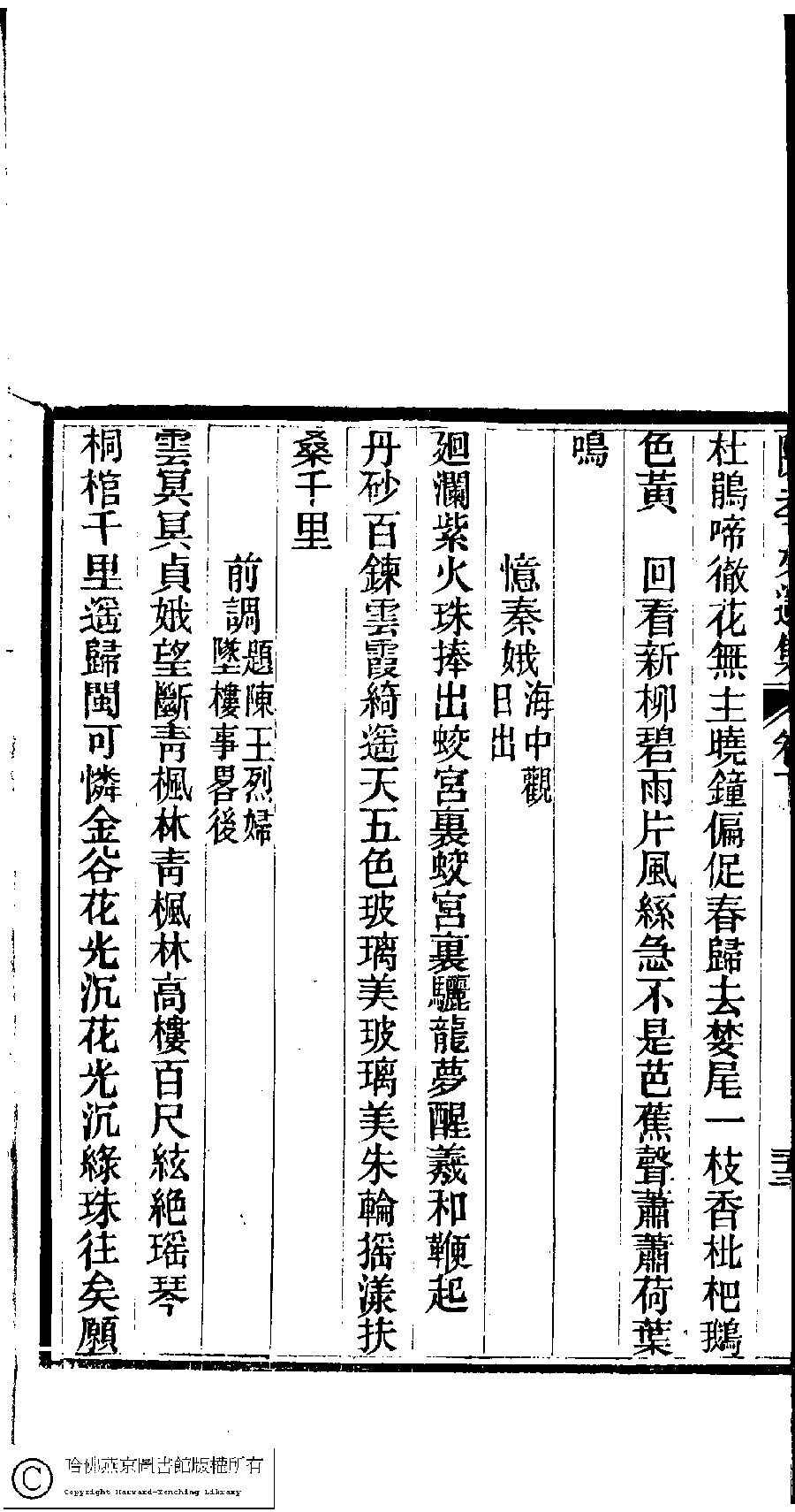 | (PRINT FRIENDLY VERSION) 陳孝女遺集﹕二卷﹔小黛軒論詩詩﹕二卷(清陳芸撰)。民國三年(1914)刻本 ![]() Page : 下.24a | click for larger image | 陳孝女遺集﹕二卷﹔小黛軒論詩詩﹕二卷(清陳芸撰)。民國三年(1914)刻本![]() Page : 下.23b | click for larger image | Back |