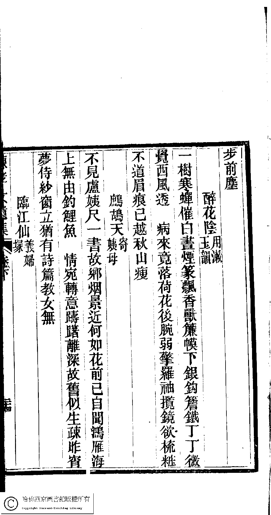 | (PRINT FRIENDLY VERSION) 陳孝女遺集﹕二卷﹔小黛軒論詩詩﹕二卷(清陳芸撰)。民國三年(1914)刻本 ![]() Page : 下.24b | click for larger image | 陳孝女遺集﹕二卷﹔小黛軒論詩詩﹕二卷(清陳芸撰)。民國三年(1914)刻本![]() Page : 下.24a | click for larger image | Back |
