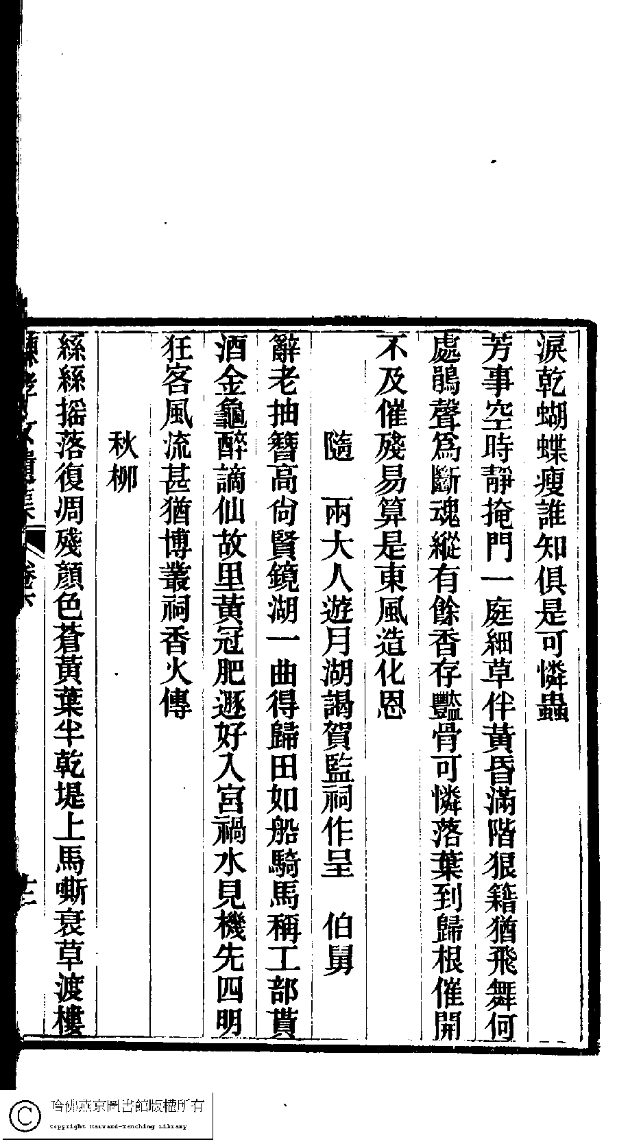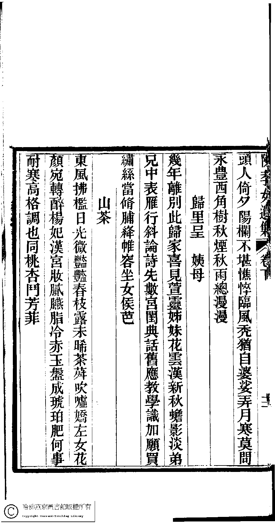 | (PRINT FRIENDLY VERSION) 陳孝女遺集﹕二卷﹔小黛軒論詩詩﹕二卷(清陳芸撰)。民國三年(1914)刻本 ![]() Page : 下.12b | click for larger image | 陳孝女遺集﹕二卷﹔小黛軒論詩詩﹕二卷(清陳芸撰)。民國三年(1914)刻本![]() Page : 下.12a | click for larger image | Back |
