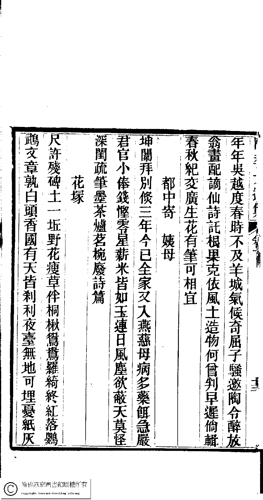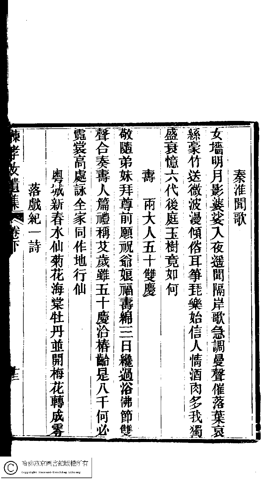 | (PRINT FRIENDLY VERSION) 陳孝女遺集﹕二卷﹔小黛軒論詩詩﹕二卷(清陳芸撰)。民國三年(1914)刻本 ![]() Page : 下.13b | click for larger image | 陳孝女遺集﹕二卷﹔小黛軒論詩詩﹕二卷(清陳芸撰)。民國三年(1914)刻本![]() Page : 下.13a | click for larger image | Back |