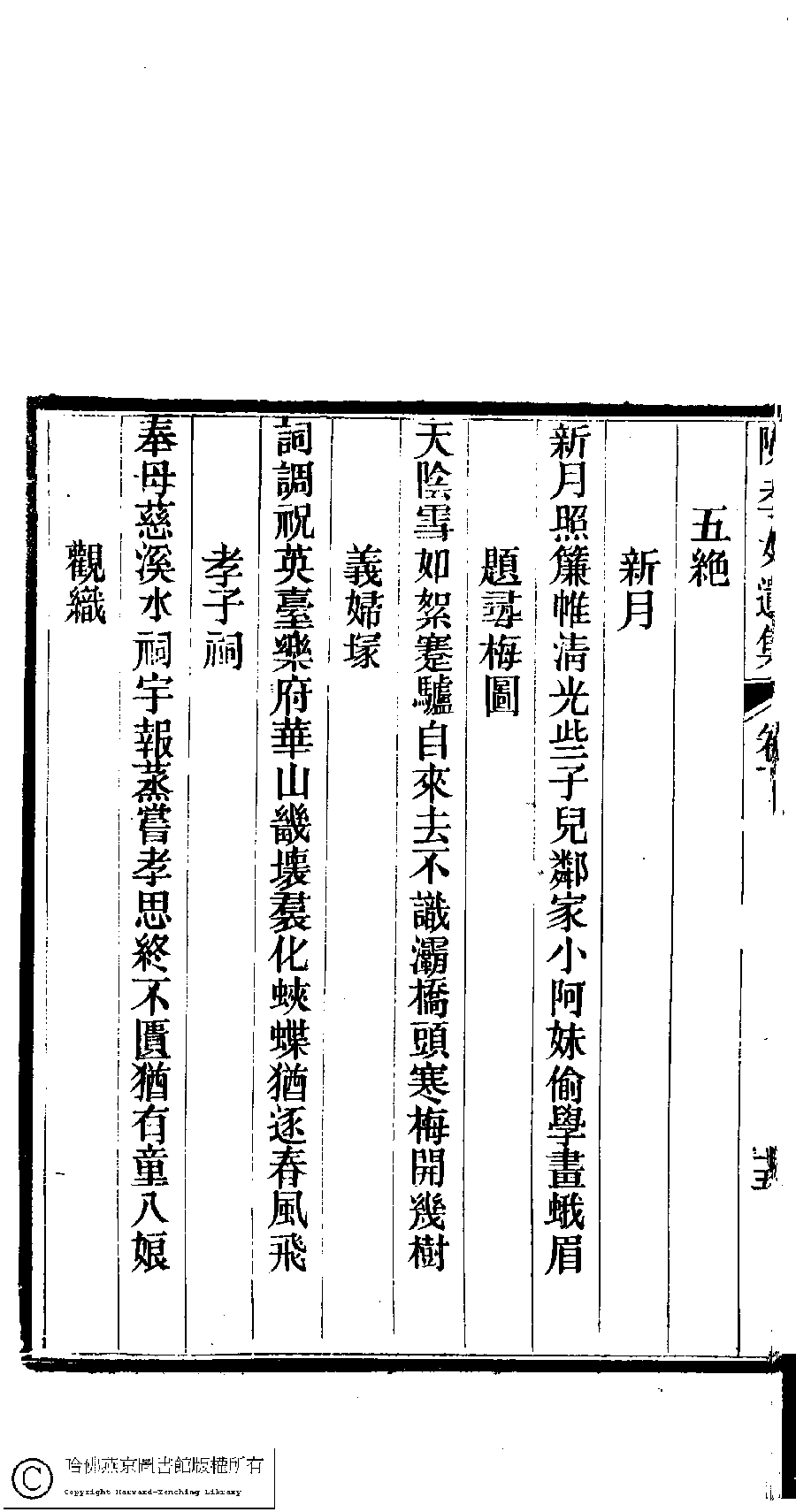 | (PRINT FRIENDLY VERSION) 陳孝女遺集﹕二卷﹔小黛軒論詩詩﹕二卷(清陳芸撰)。民國三年(1914)刻本 ![]() Page : 下.15b | click for larger image | Back |