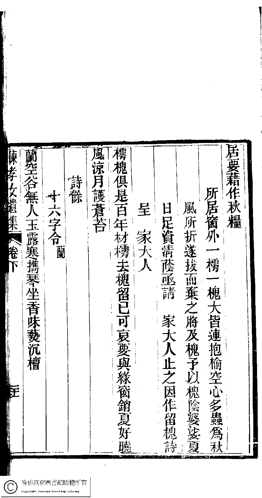 | (PRINT FRIENDLY VERSION) 陳孝女遺集﹕二卷﹔小黛軒論詩詩﹕二卷(清陳芸撰)。民國三年(1914)刻本 ![]() Page : 下.21a | click for larger image | Back |