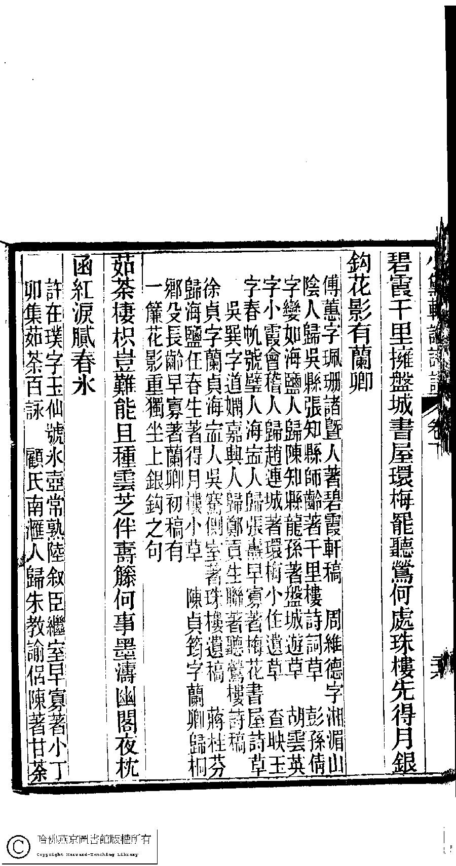| (PRINT FRIENDLY VERSION) 陳孝女遺集﹕二卷﹔小黛軒論詩詩﹕二卷(清陳芸撰)。民國三年(1914)刻本 ![]() Page : 下.26b | click for larger image | Back |