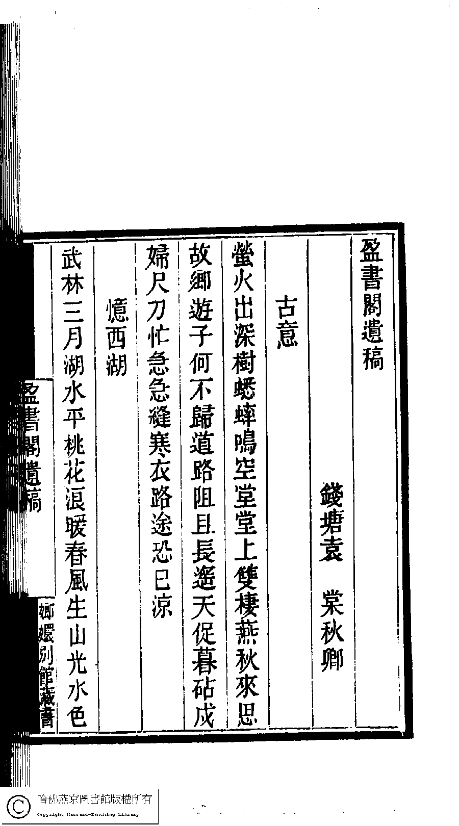 | (PRINT FRIENDLY VERSION) 國朝閨閣詩鈔﹕一百種一百卷(清蔡殿齊輯) : 盈書閣遺稿﹕一卷。清道光二十四年(1844)刻本。 ![]() Page : 5.12a | click for larger image | Back |