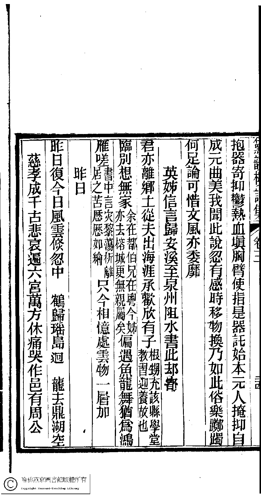 | (PRINT FRIENDLY VERSION) 黛韻樓遺集(清薛紹徽撰)。甲寅閏月(1914)刻本。 ![]() Page : 3.24b | click for larger image | Back |