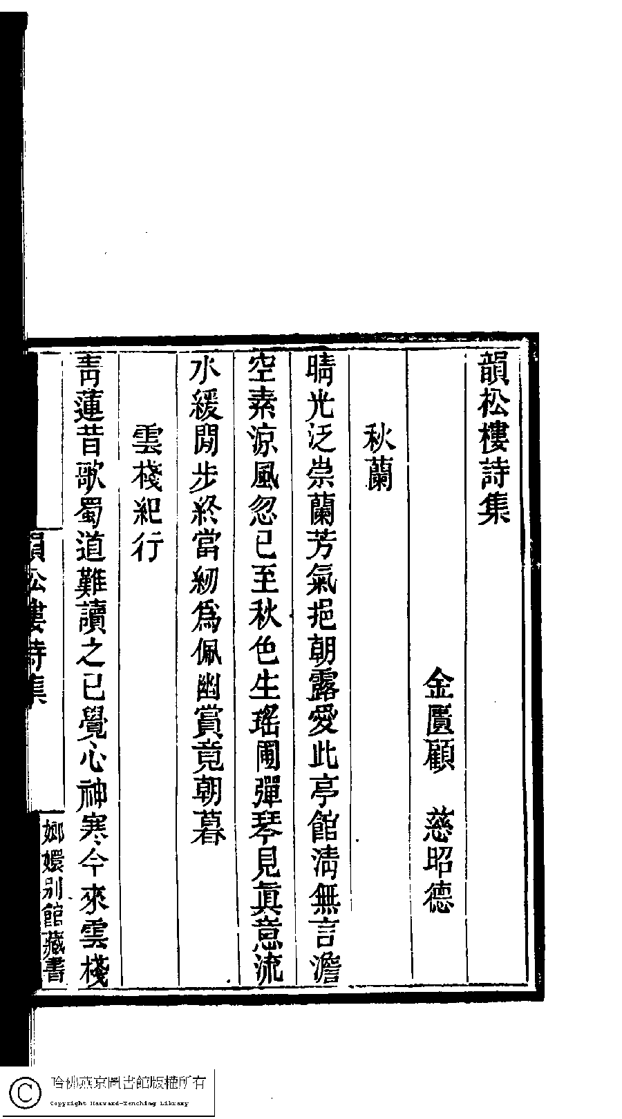 | (PRINT FRIENDLY VERSION) 國朝閨閣詩鈔﹕一百種一百卷(清蔡殿齊輯) : 韻松樓詩集﹕一卷。清道光二十四年(1844)刻本。 ![]() Page : 6.14a | click for larger image | Back |