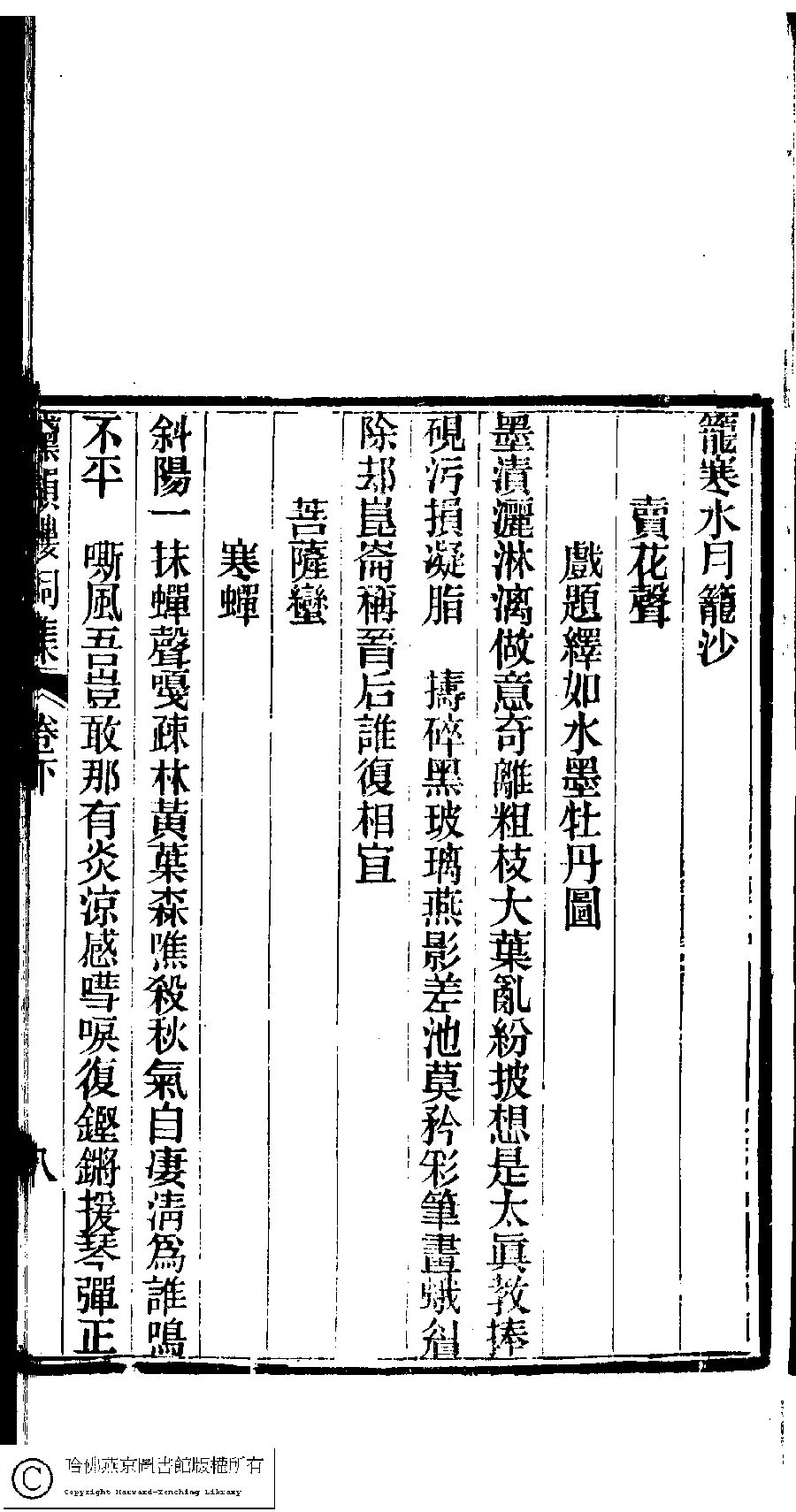 | (PRINT FRIENDLY VERSION) 黛韻樓遺集(清薛紹徽撰)。甲寅閏月(1914)刻本。 ![]() Page : 卷下.8a | click for larger image | Back |