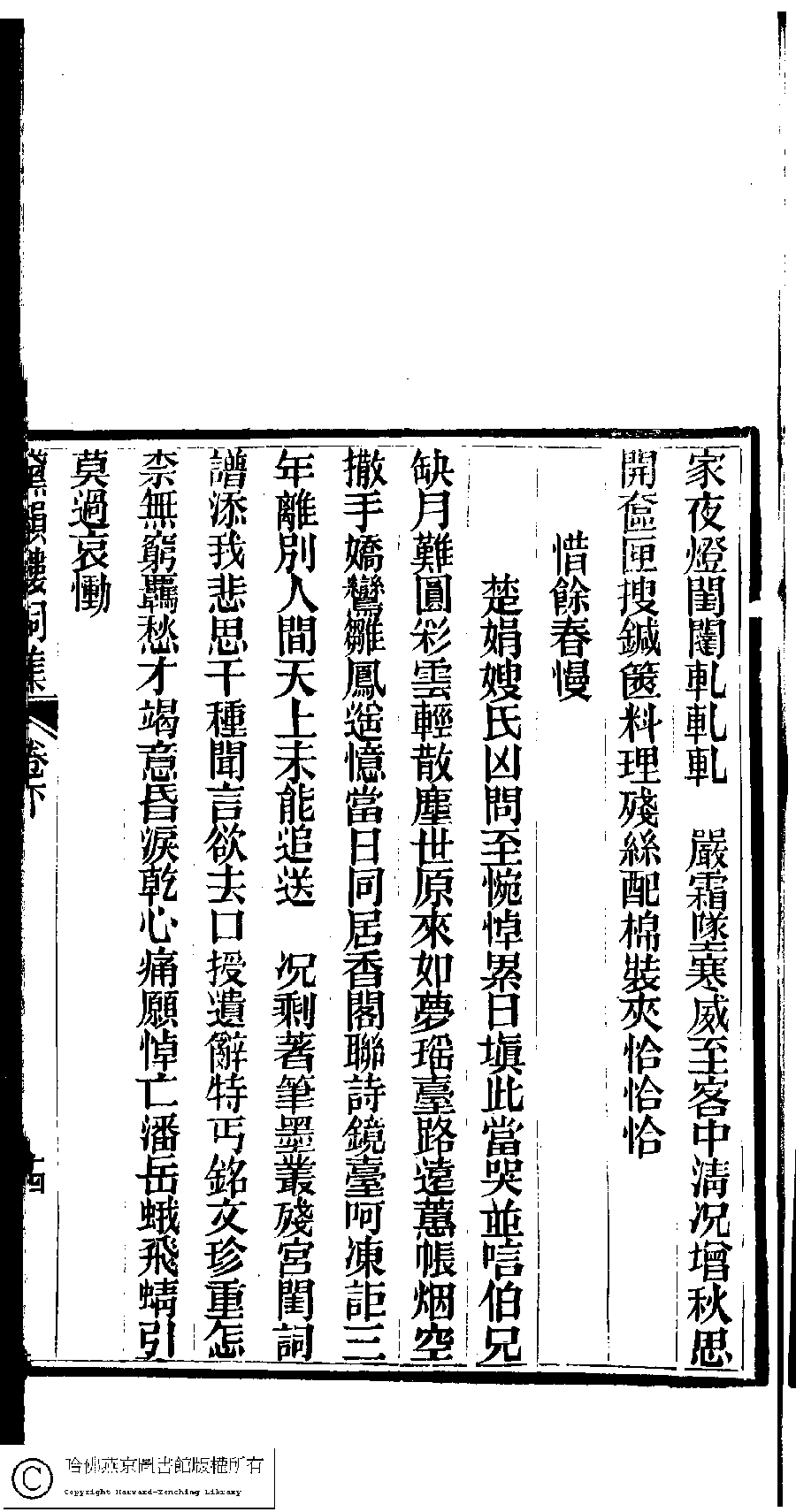 | (PRINT FRIENDLY VERSION) 黛韻樓遺集(清薛紹徽撰)。甲寅閏月(1914)刻本。 ![]() Page : 卷下.14a | click for larger image | Back |