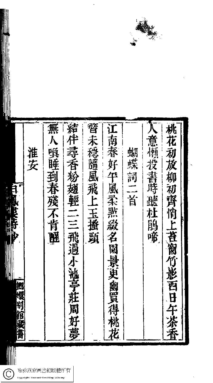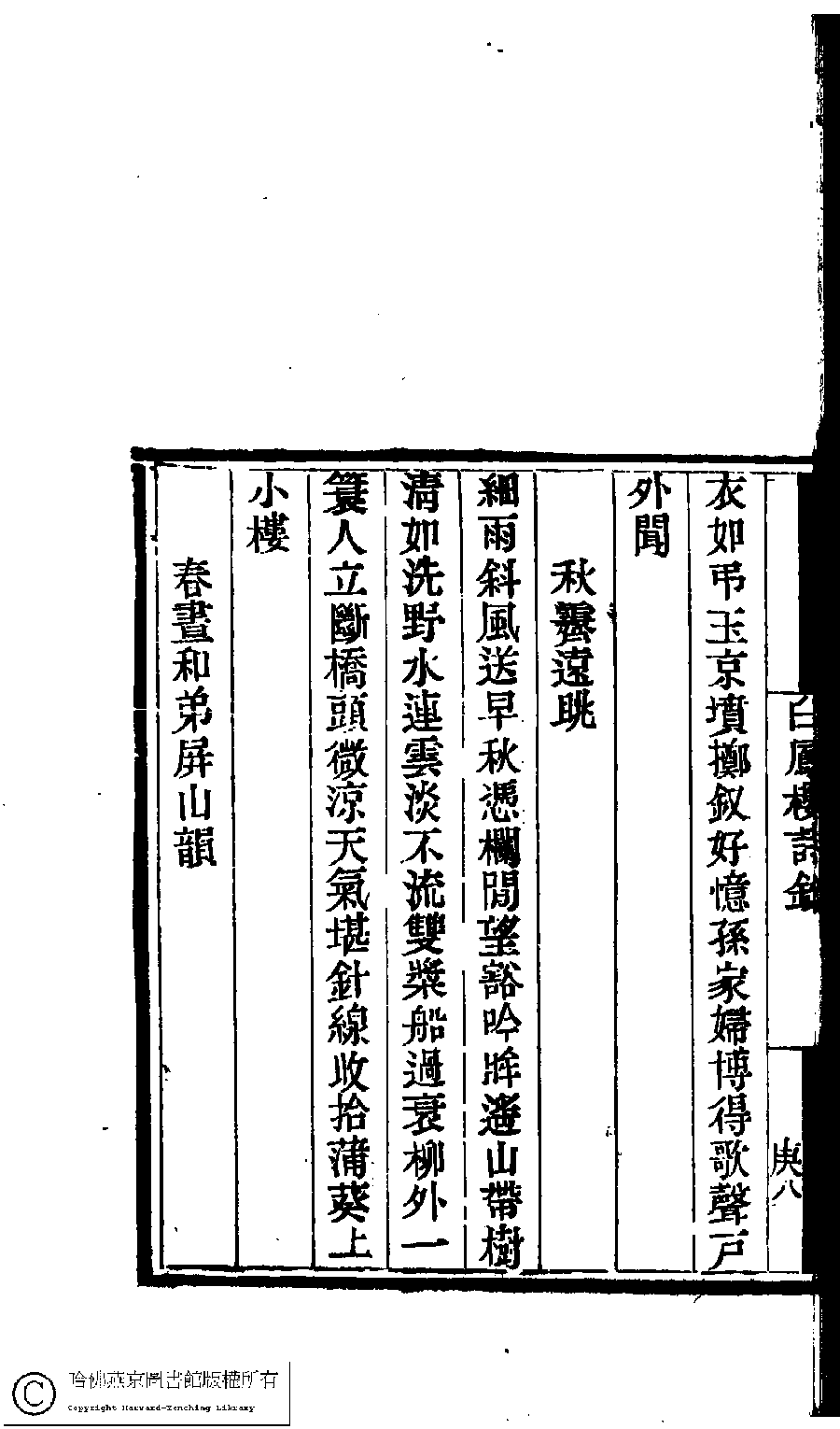 | (PRINT FRIENDLY VERSION) 國朝閨閣詩鈔﹕一百種一百卷(清蔡殿齊輯) : 白鳳樓詩鈔﹕一卷。清道光二十四年(1844)刻本。 ![]() Page : 7.9a | click for larger image | 國朝閨閣詩鈔﹕一百種一百卷(清蔡殿齊輯) : 白鳳樓詩鈔﹕一卷。清道光二十四年(1844)刻本。![]() Page : 7.8b | click for larger image | Back |