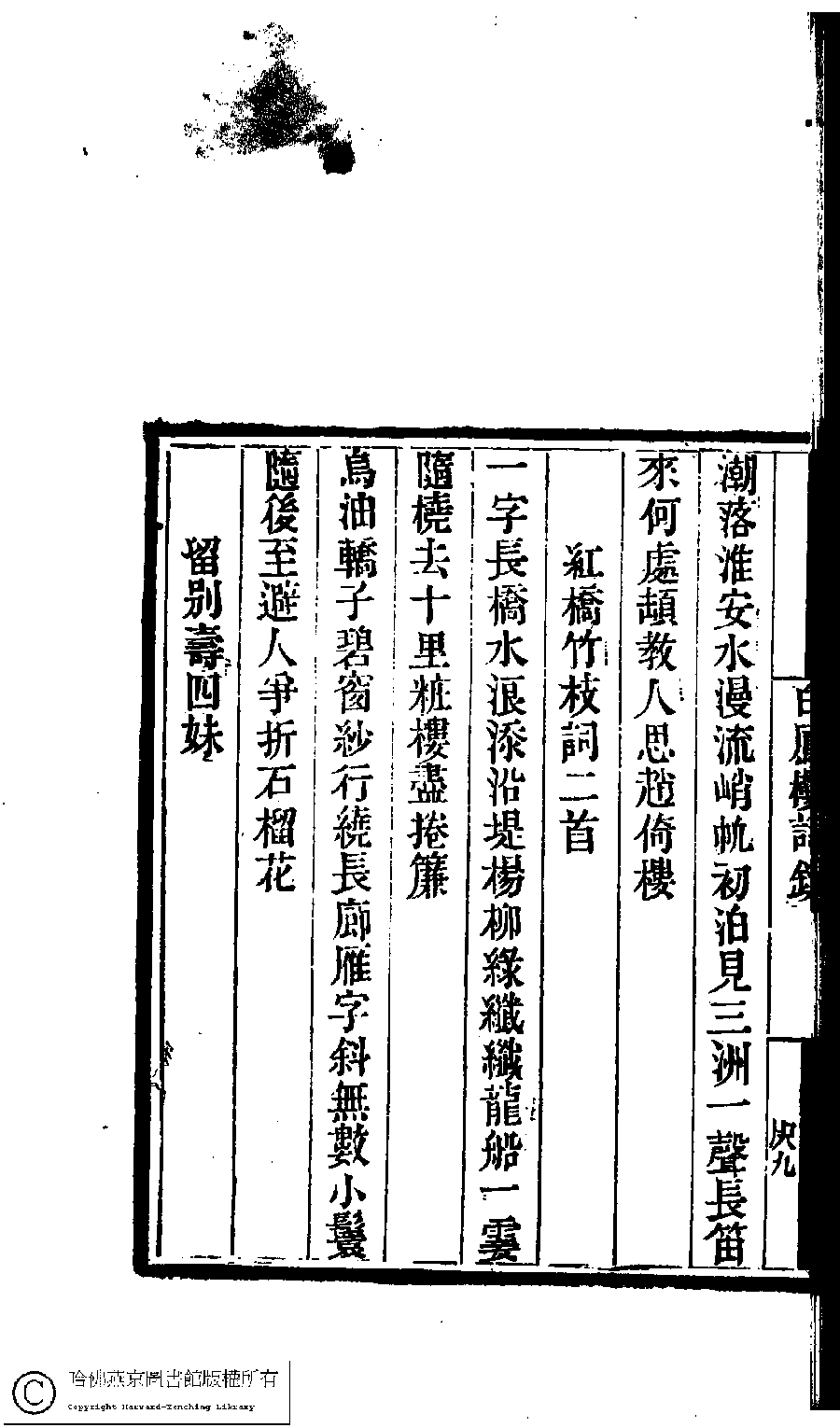 | (PRINT FRIENDLY VERSION) 國朝閨閣詩鈔﹕一百種一百卷(清蔡殿齊輯) : 白鳳樓詩鈔﹕一卷。清道光二十四年(1844)刻本。 ![]() Page : 7.9b | click for larger image | Back |