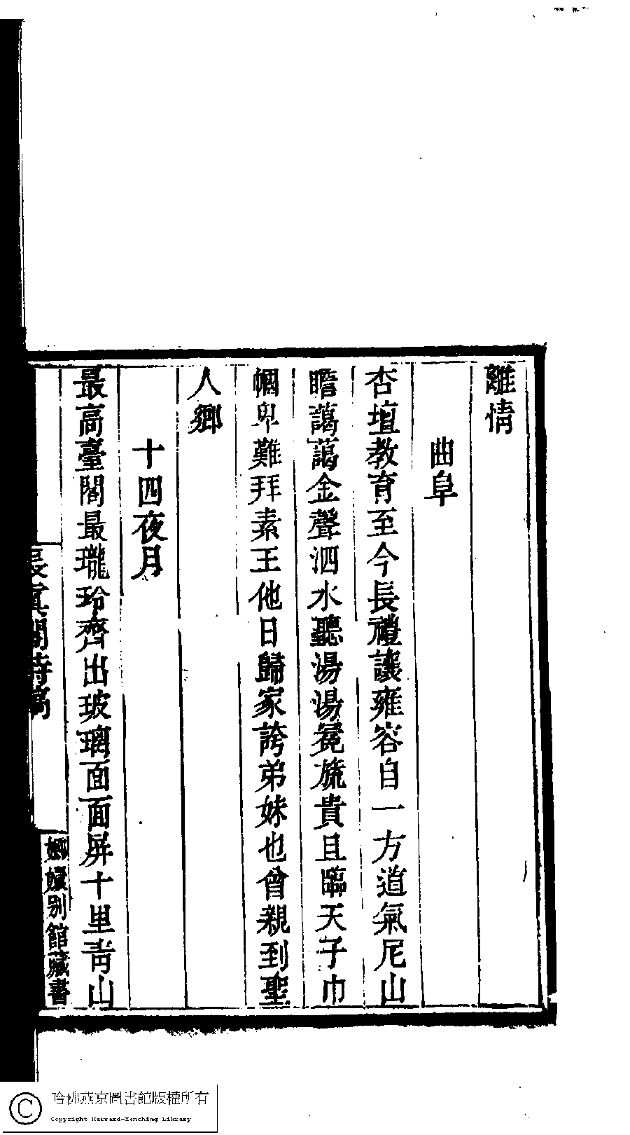 | (PRINT FRIENDLY VERSION) 國朝閨閣詩鈔﹕一百種一百卷(清蔡殿齊輯) : 長真閣詩稿﹕一卷。清道光二十四年(1844)刻本。 ![]() Page : 7.15a | click for larger image | Back |