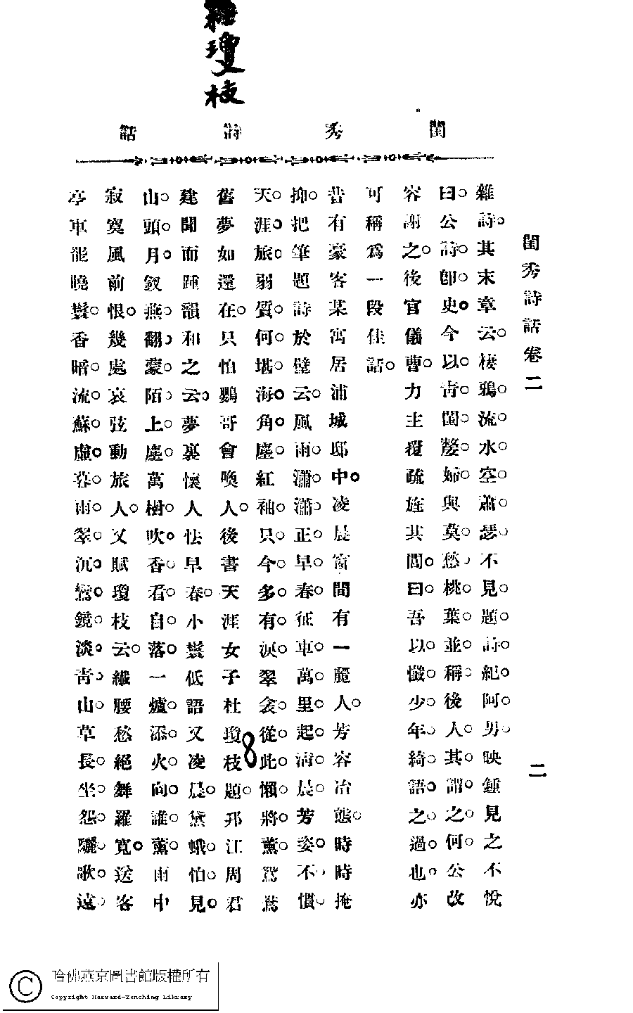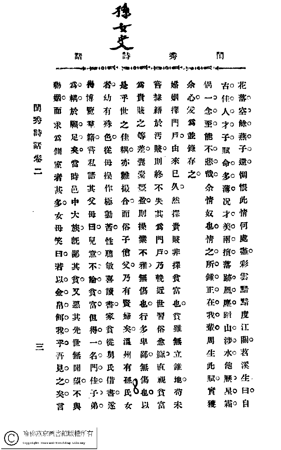 | (PRINT FRIENDLY VERSION) 閨秀詩話﹕四卷(苕溪生輯)。民國丙寅(1926)鉛印本。 ![]() Page : 2.3 | click for larger image | 閨秀詩話﹕四卷(苕溪生輯)。民國丙寅(1926)鉛印本。![]() Page : 2.2 | click for larger image | Back |
