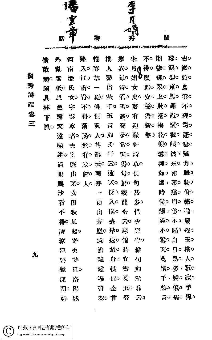 | (PRINT FRIENDLY VERSION) 閨秀詩話﹕四卷(苕溪生輯)。民國丙寅(1926)鉛印本。 ![]() Page : 3.9 | click for larger image | Back |