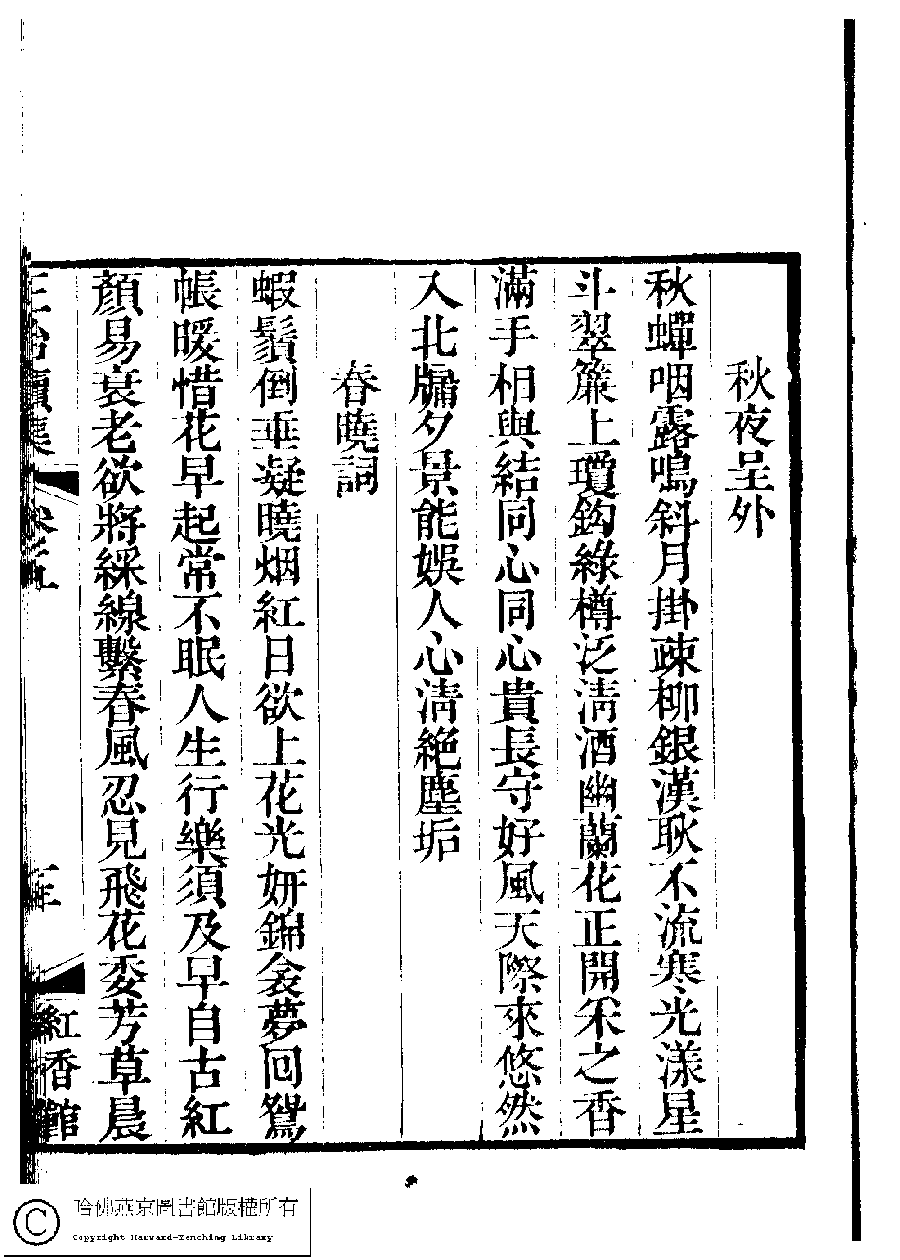 | (PRINT FRIENDLY VERSION) 國朝閨秀正始續集﹕十卷﹐附錄﹕一卷﹐補遺﹕一卷﹐輓詞﹕一卷(清惲珠輯)。清道光十六年(1836)紅香館刻本。 ![]() Page : 5.13b | click for larger image | 國朝閨秀正始續集﹕十卷﹐附錄﹕一卷﹐補遺﹕一卷﹐輓詞﹕一卷(清惲珠輯)。清道光十六年(1836)紅香館刻本。![]() Page : 5.13a | click for larger image | Back |