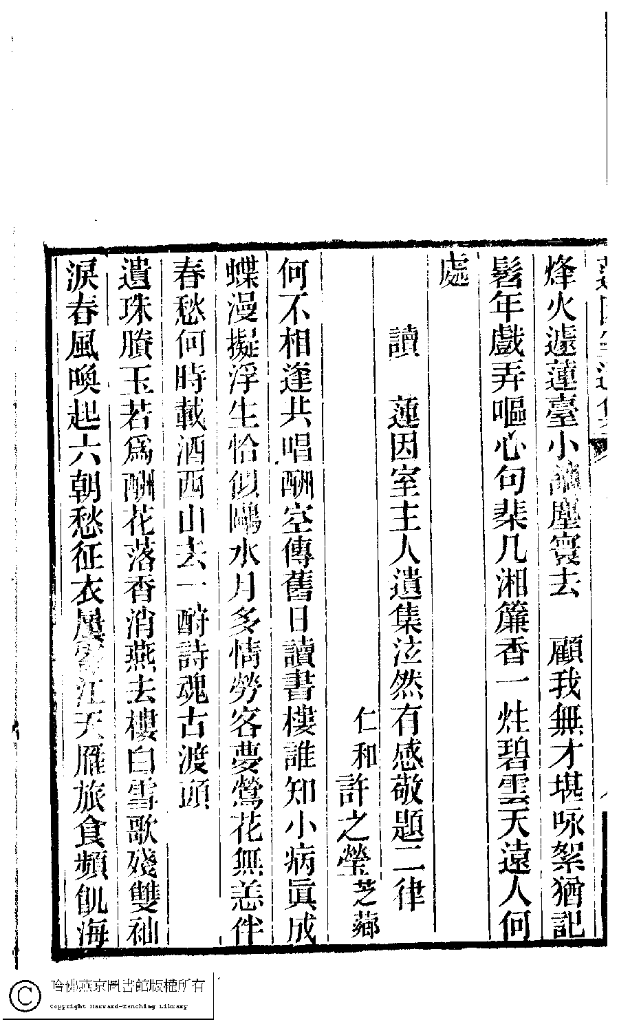 | (PRINT FRIENDLY VERSION) 蓮因室詩集﹕二卷﹐詞集﹕一卷(清鄭蘭孫撰)。清光緒元年(1875)刻本 ![]() Page : 題辭.8b | click for larger image | 蓮因室詩集﹕二卷﹐詞集﹕一卷(清鄭蘭孫撰)。清光緒元年(1875)刻本![]() Page : 題辭.8a | click for larger image | Back |