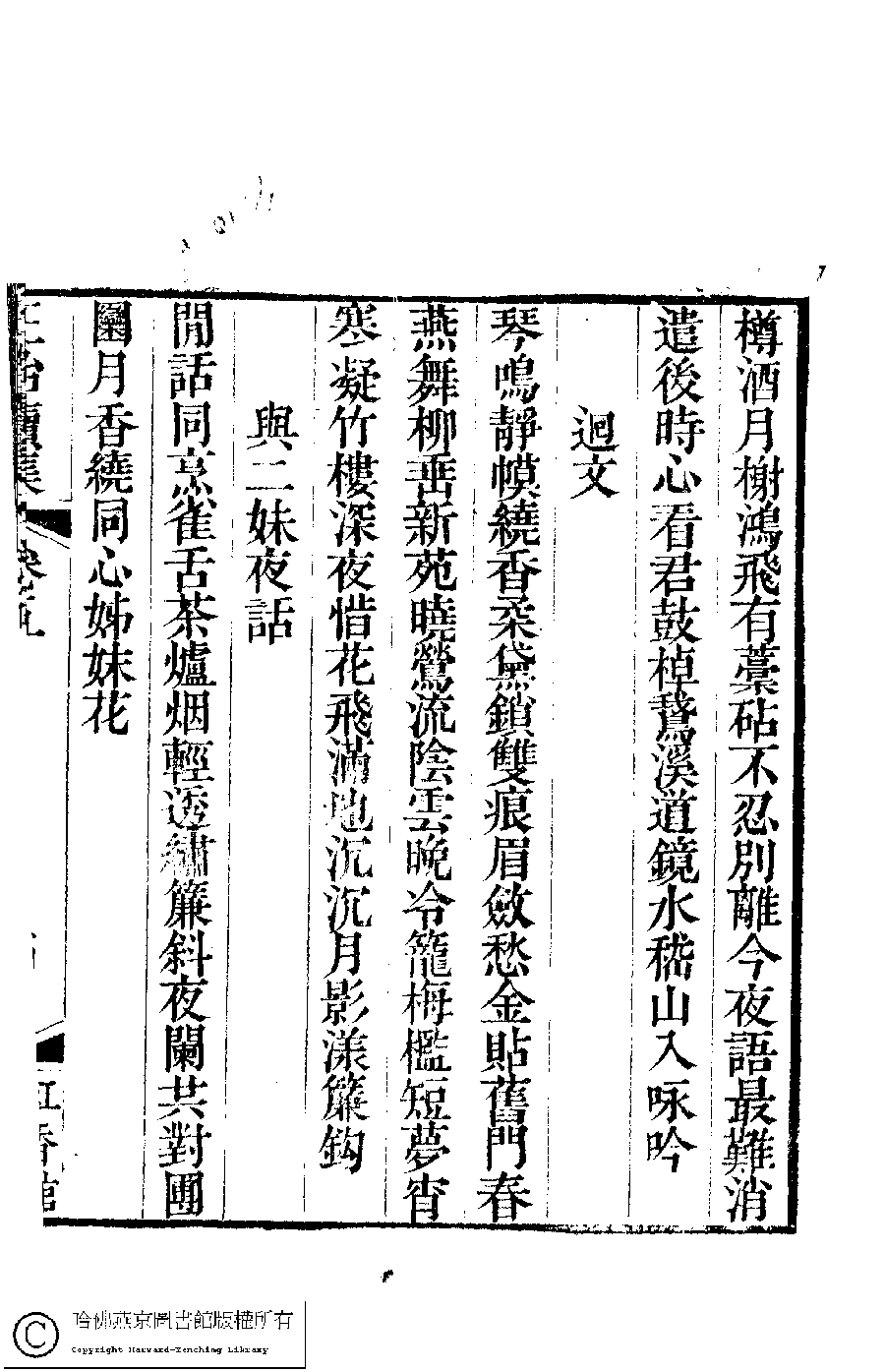 | (PRINT FRIENDLY VERSION) 國朝閨秀正始續集﹕十卷﹐附錄﹕一卷﹐補遺﹕一卷﹐輓詞﹕一卷(清惲珠輯)。清道光十六年(1836)紅香館刻本。 ![]() Page : 5.14a | click for larger image | 國朝閨秀正始續集﹕十卷﹐附錄﹕一卷﹐補遺﹕一卷﹐輓詞﹕一卷(清惲珠輯)。清道光十六年(1836)紅香館刻本。![]() Page : 5.13b | click for larger image | Back |