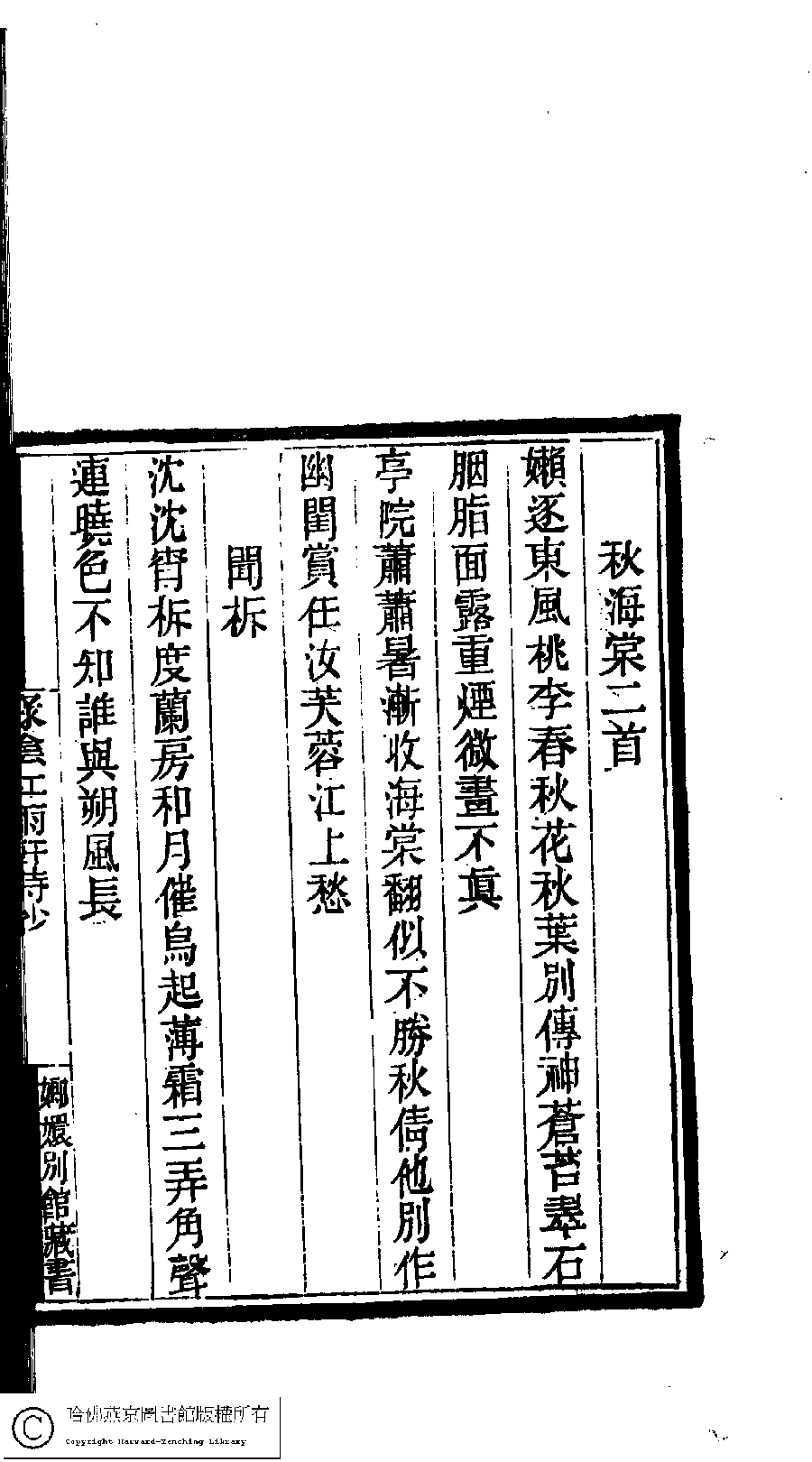 | Appears in: Guo chao gui ge shi chao: 100 zhong 100 juan (edited by Cai Dianqi, Qing dynasty): Lü yin hong yu xuan shi chao: 1 juan |