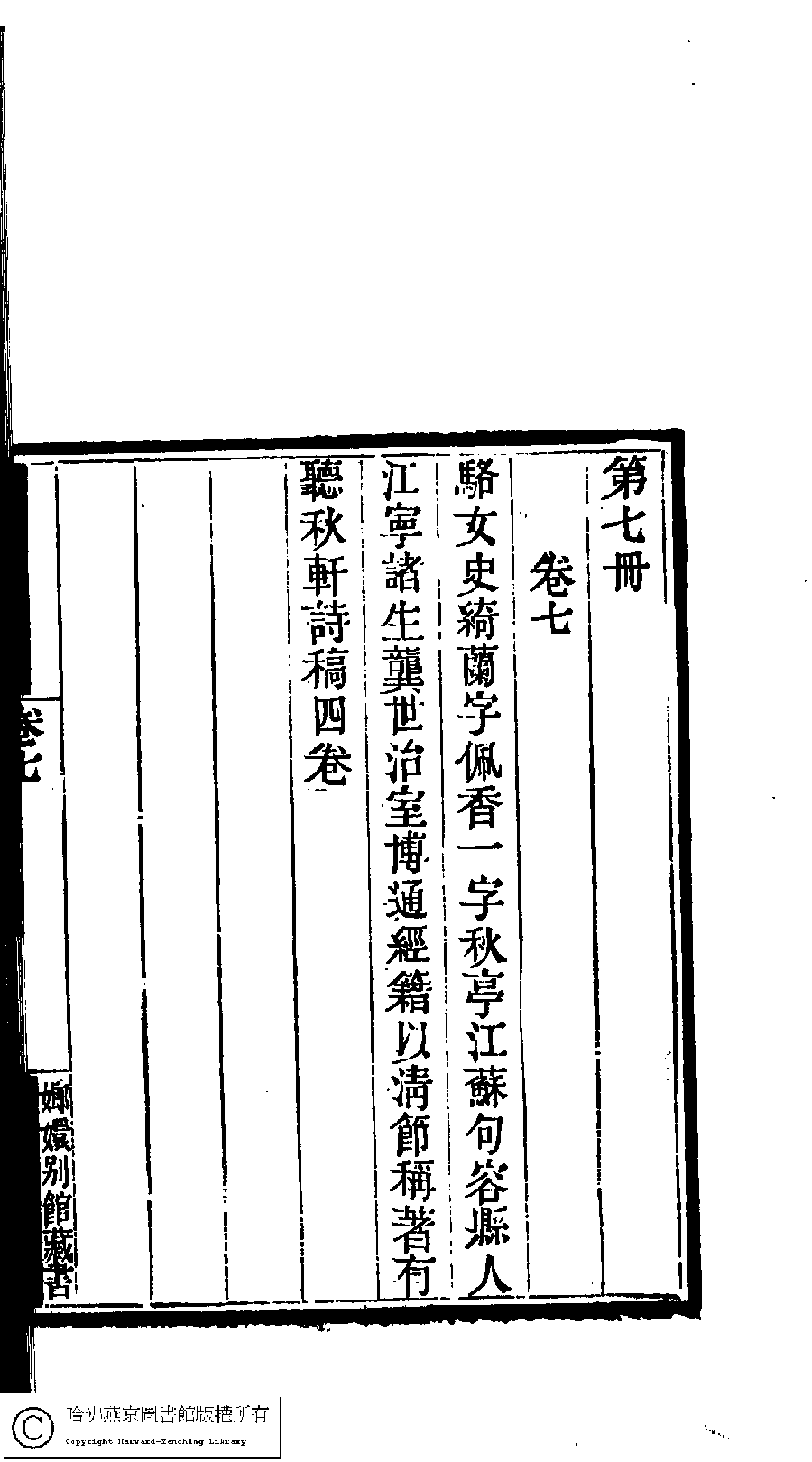 | (PRINT FRIENDLY VERSION) 國朝閨閣詩鈔﹕一百種一百卷(清蔡殿齊輯) : 聽秋軒詩稿﹕一卷。清道光二十四年(1844)刻本。 ![]() Page : 7.35b | click for larger image | 國朝閨閣詩鈔﹕一百種一百卷(清蔡殿齊輯) : 聽秋軒詩稿﹕一卷。清道光二十四年(1844)刻本。![]() Page : 7.35a | click for larger image | Back |