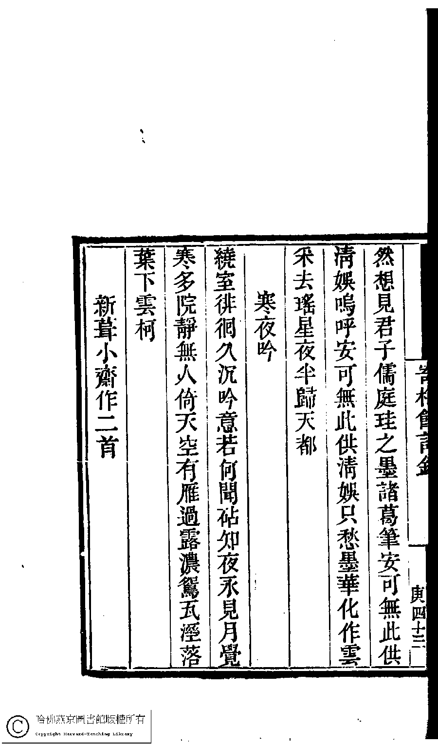 | (PRINT FRIENDLY VERSION) 國朝閨閣詩鈔﹕一百種一百卷(清蔡殿齊輯) : 寄梅館詩鈔﹕一卷。清道光二十四年(1844)刻本。 ![]() Page : 7.43b | click for larger image | Back |