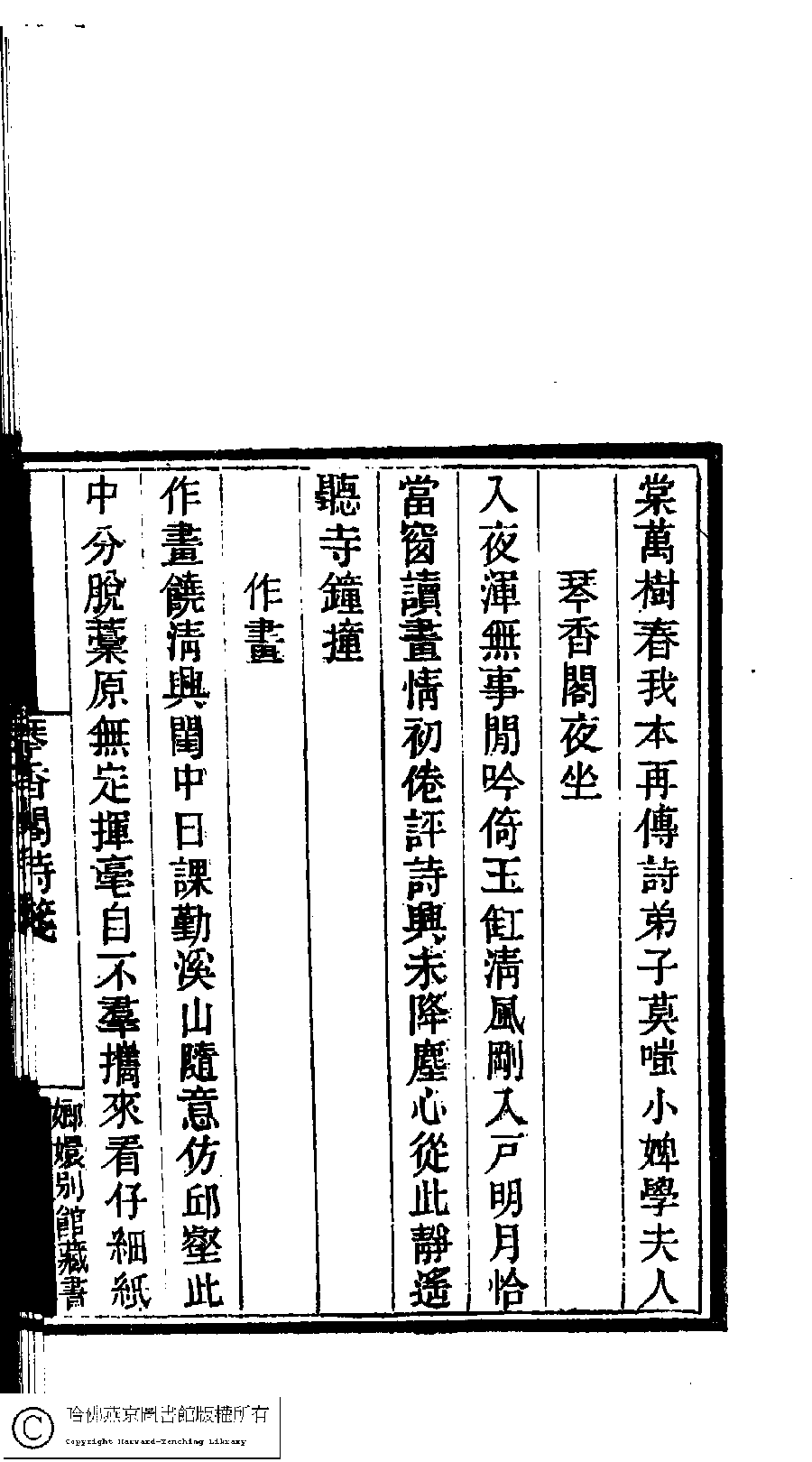 | (PRINT FRIENDLY VERSION) 國朝閨閣詩鈔﹕一百種一百卷(清蔡殿齊輯) : 琴香閣詩箋﹕一卷。清道光二十四年(1844)刻本。 ![]() Page : 8.8a | click for larger image | Back |