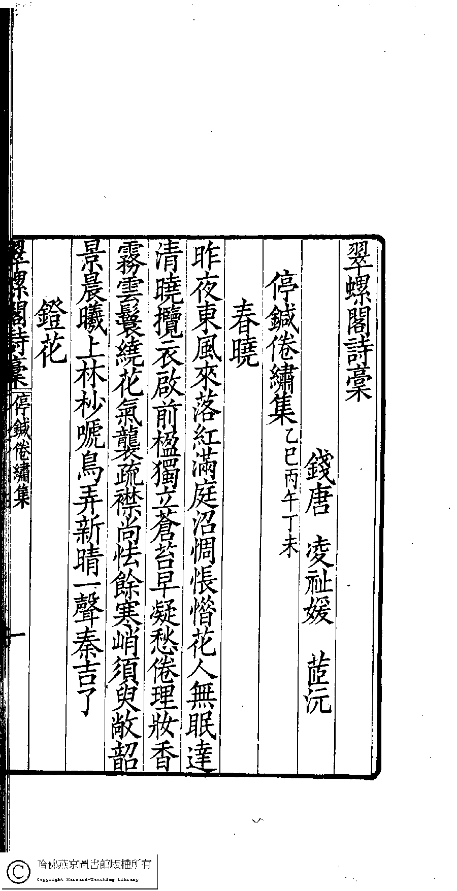 | (PRINT FRIENDLY VERSION) 翠螺閣詩詞稾﹕五卷﹐附舞鏡集﹕一卷(清凌祉媛撰)。清咸豐四年(1854)刻本。 ![]() Page : 詩稿.1.1a | click for larger image | Back |
