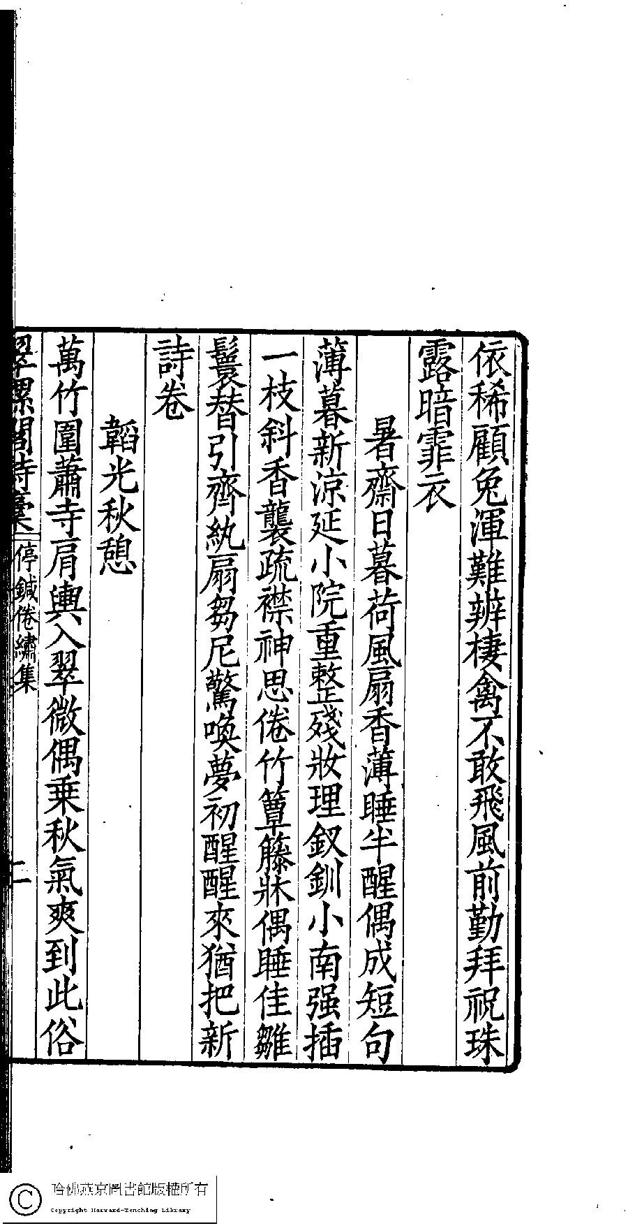 | (PRINT FRIENDLY VERSION) 翠螺閣詩詞稾﹕五卷﹐附舞鏡集﹕一卷(清凌祉媛撰)。清咸豐四年(1854)刻本。 ![]() Page : 詩稿.1.2b | click for larger image | 翠螺閣詩詞稾﹕五卷﹐附舞鏡集﹕一卷(清凌祉媛撰)。清咸豐四年(1854)刻本。![]() Page : 詩稿.1.2a | click for larger image | Back |