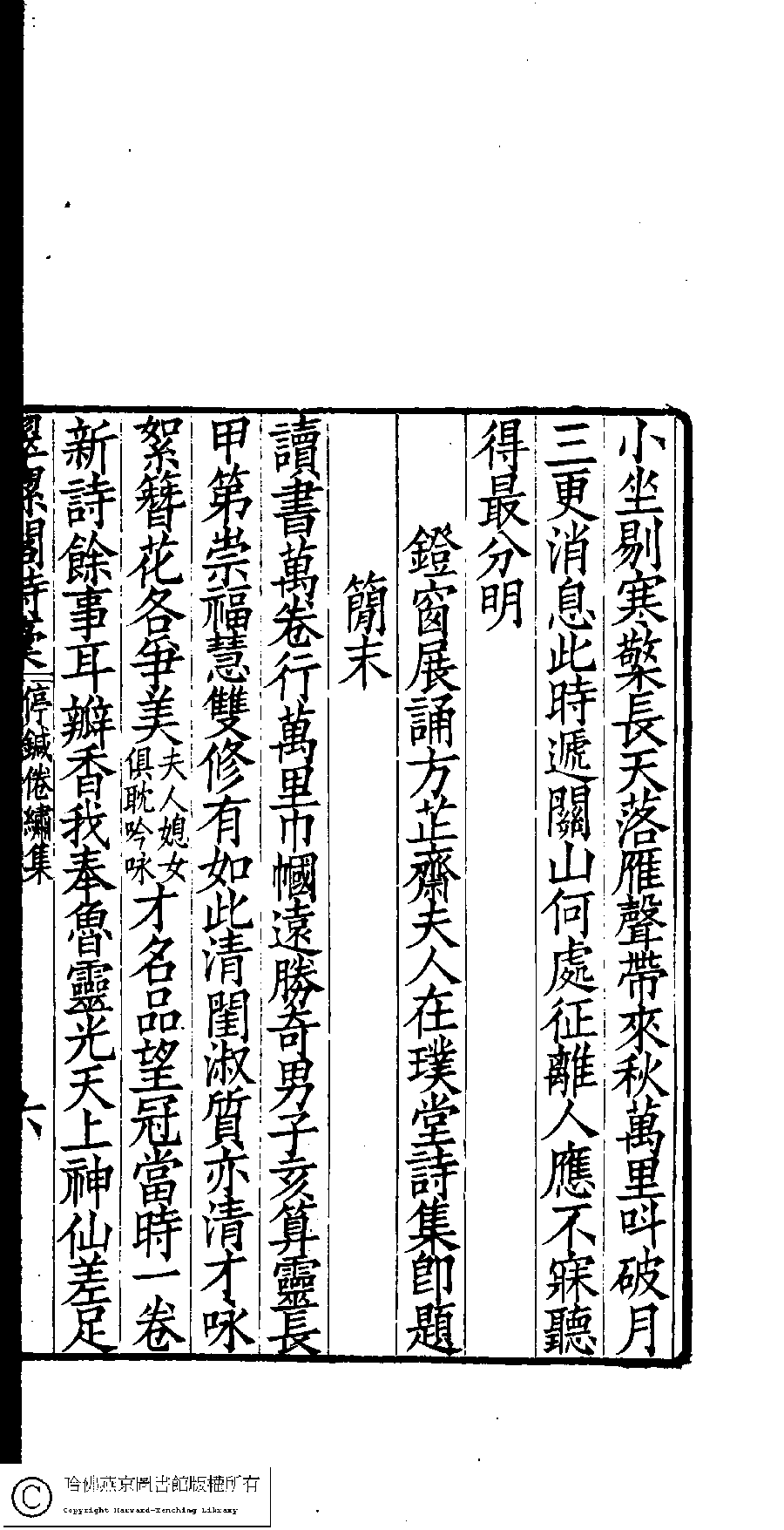 | (PRINT FRIENDLY VERSION) 翠螺閣詩詞稾﹕五卷﹐附舞鏡集﹕一卷(清凌祉媛撰)。清咸豐四年(1854)刻本。 ![]() Page : 詩稿.1.6b | click for larger image | 翠螺閣詩詞稾﹕五卷﹐附舞鏡集﹕一卷(清凌祉媛撰)。清咸豐四年(1854)刻本。![]() Page : 詩稿.1.6a | click for larger image | Back |