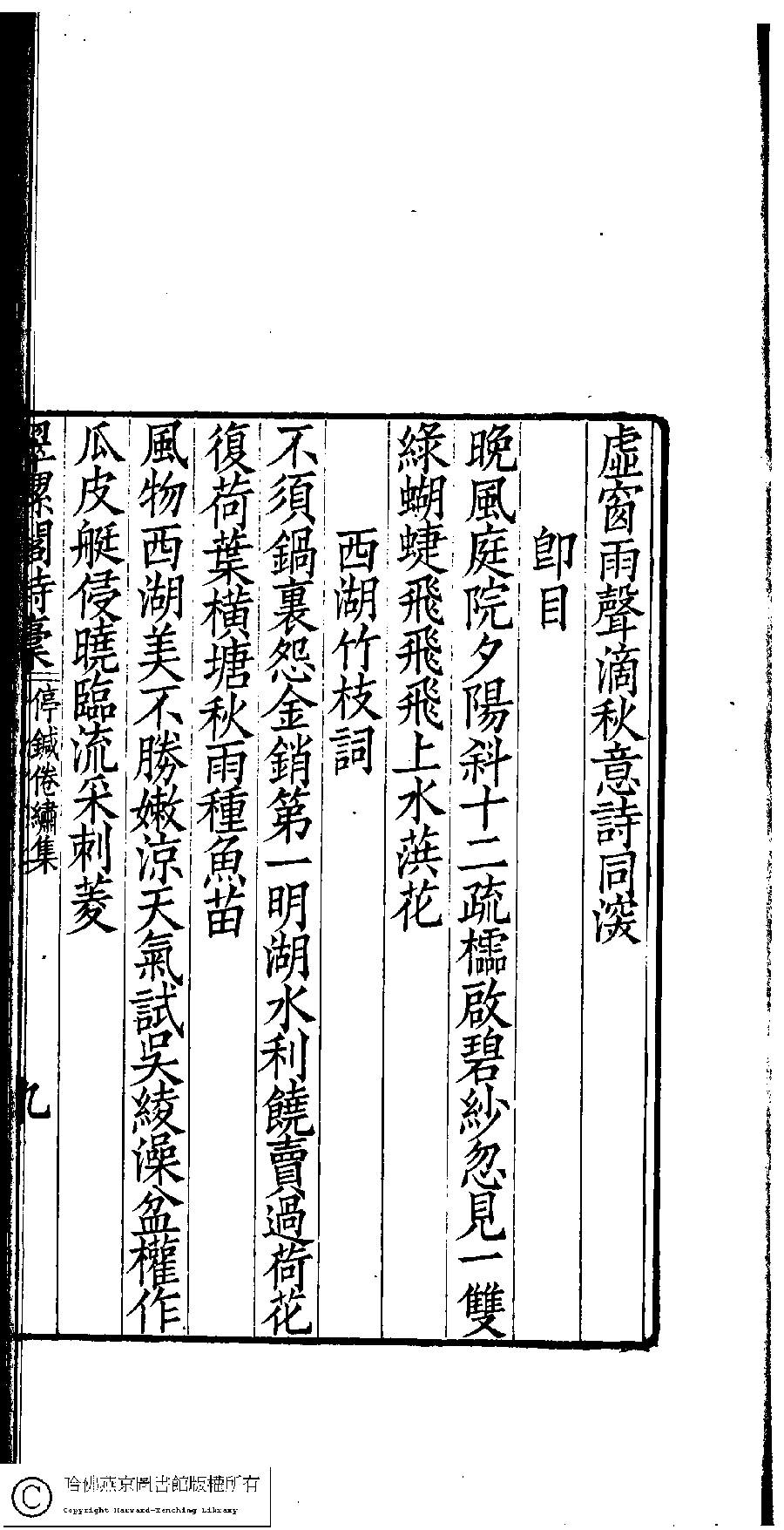 | (PRINT FRIENDLY VERSION) 翠螺閣詩詞稾﹕五卷﹐附舞鏡集﹕一卷(清凌祉媛撰)。清咸豐四年(1854)刻本。 ![]() Page : 詩稿.1.9a | click for larger image | Back |