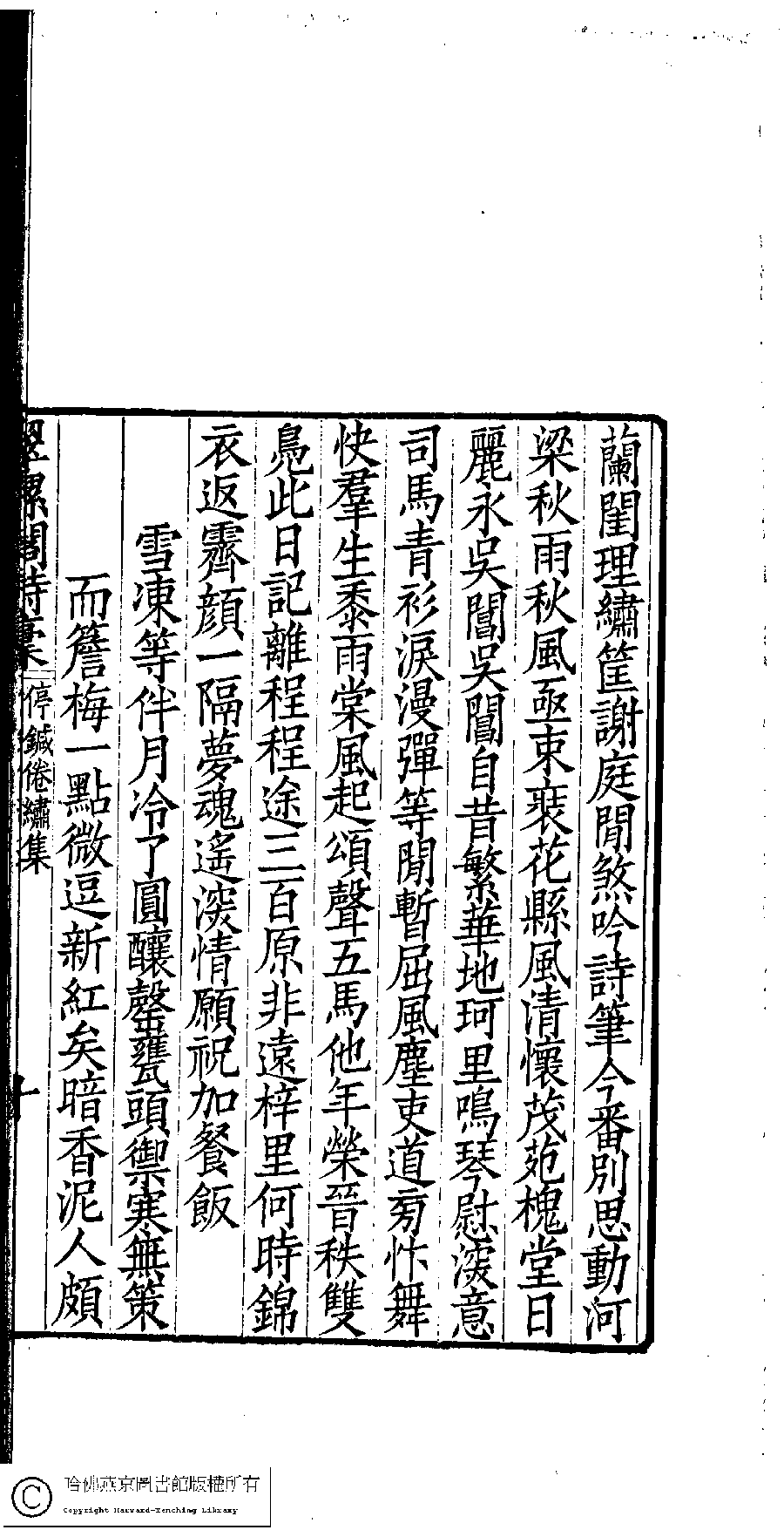 | (PRINT FRIENDLY VERSION) 翠螺閣詩詞稾﹕五卷﹐附舞鏡集﹕一卷(清凌祉媛撰)。清咸豐四年(1854)刻本。 ![]() Page : 詩稿.1.10b | click for larger image | 翠螺閣詩詞稾﹕五卷﹐附舞鏡集﹕一卷(清凌祉媛撰)。清咸豐四年(1854)刻本。![]() Page : 詩稿.1.10a | click for larger image | Back |