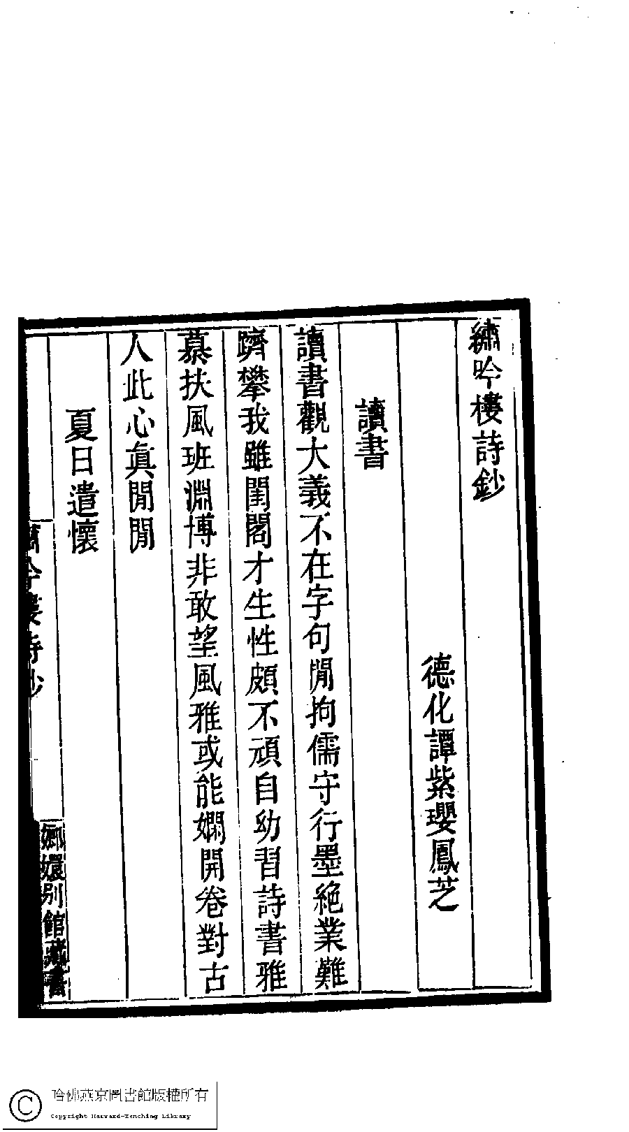 | (PRINT FRIENDLY VERSION) 國朝閨閣詩鈔﹕一百種一百卷(清蔡殿齊輯) : 繡吟樓詩鈔﹕一卷。清道光二十四年(1844)刻本。 ![]() Page : 9.45a | click for larger image | Back |