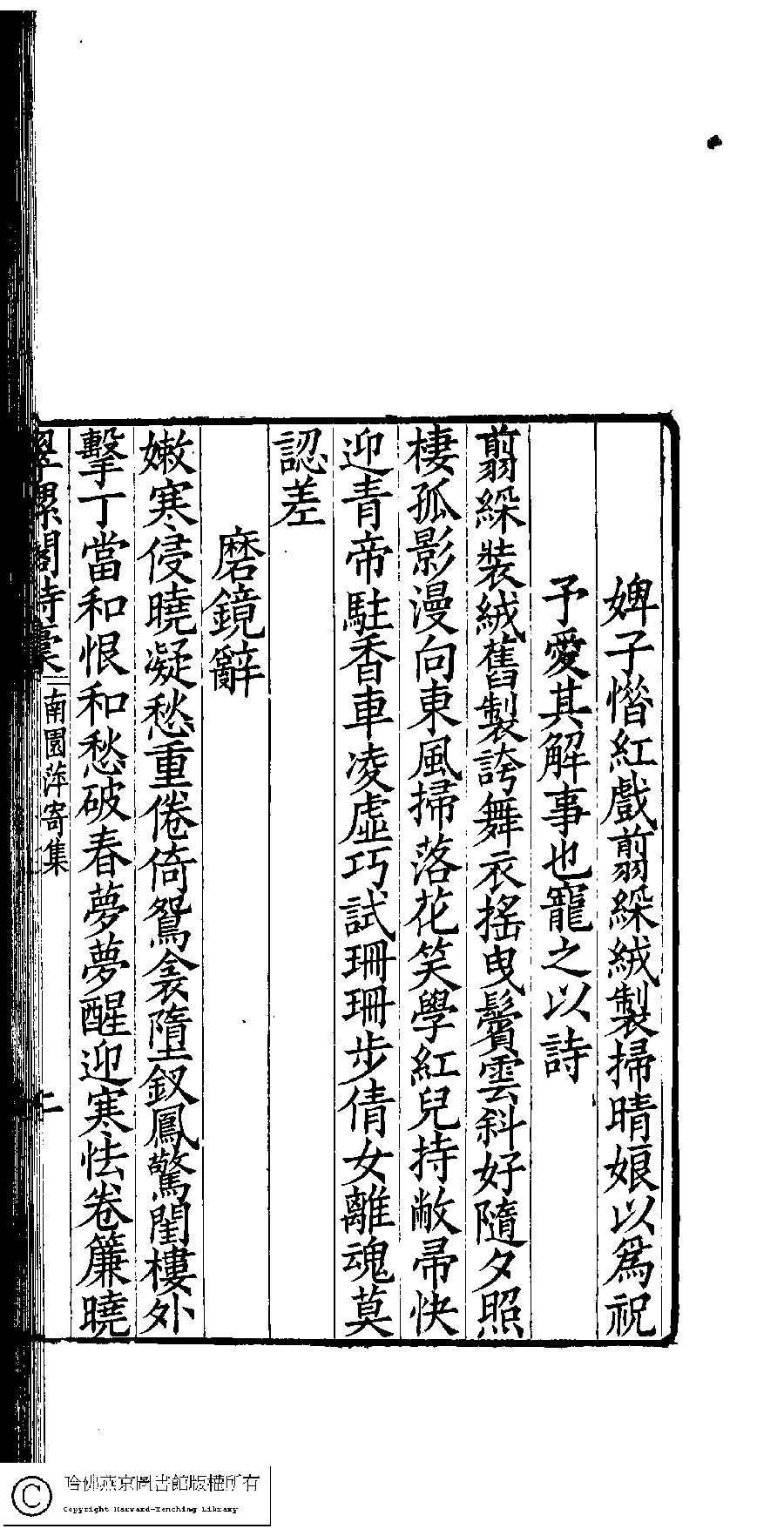| (PRINT FRIENDLY VERSION) 翠螺閣詩詞稾﹕五卷﹐附舞鏡集﹕一卷(清凌祉媛撰)。清咸豐四年(1854)刻本。 ![]() Page : 詩稿.2.2a | click for larger image | 翠螺閣詩詞稾﹕五卷﹐附舞鏡集﹕一卷(清凌祉媛撰)。清咸豐四年(1854)刻本。![]() Page : 詩稿.2.1b | click for larger image | Back |