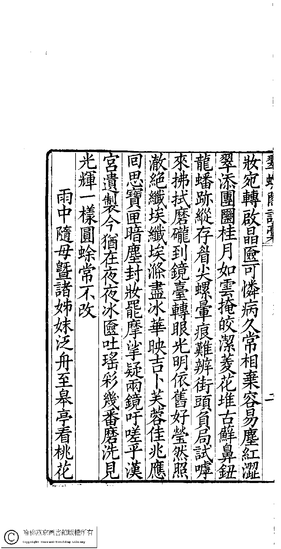 | (PRINT FRIENDLY VERSION) 翠螺閣詩詞稾﹕五卷﹐附舞鏡集﹕一卷(清凌祉媛撰)。清咸豐四年(1854)刻本。 ![]() Page : 詩稿.2.3b | click for larger image | 翠螺閣詩詞稾﹕五卷﹐附舞鏡集﹕一卷(清凌祉媛撰)。清咸豐四年(1854)刻本。![]() Page : 詩稿.2.3a | click for larger image | 翠螺閣詩詞稾﹕五卷﹐附舞鏡集﹕一卷(清凌祉媛撰)。清咸豐四年(1854)刻本。![]() Page : 詩稿.2.2b | click for larger image | Back |
