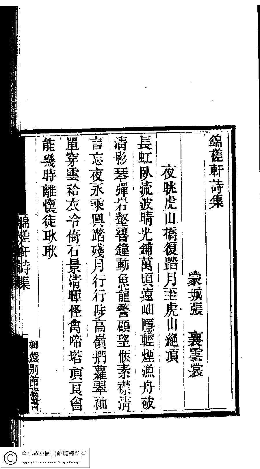 | (PRINT FRIENDLY VERSION) 國朝閨閣詩鈔﹕一百種一百卷(清蔡殿齊輯) : 錦槎軒詩稿﹕一卷。清道光二十四年(1844)刻本。 ![]() Page : 10.12a | click for larger image | Back |
