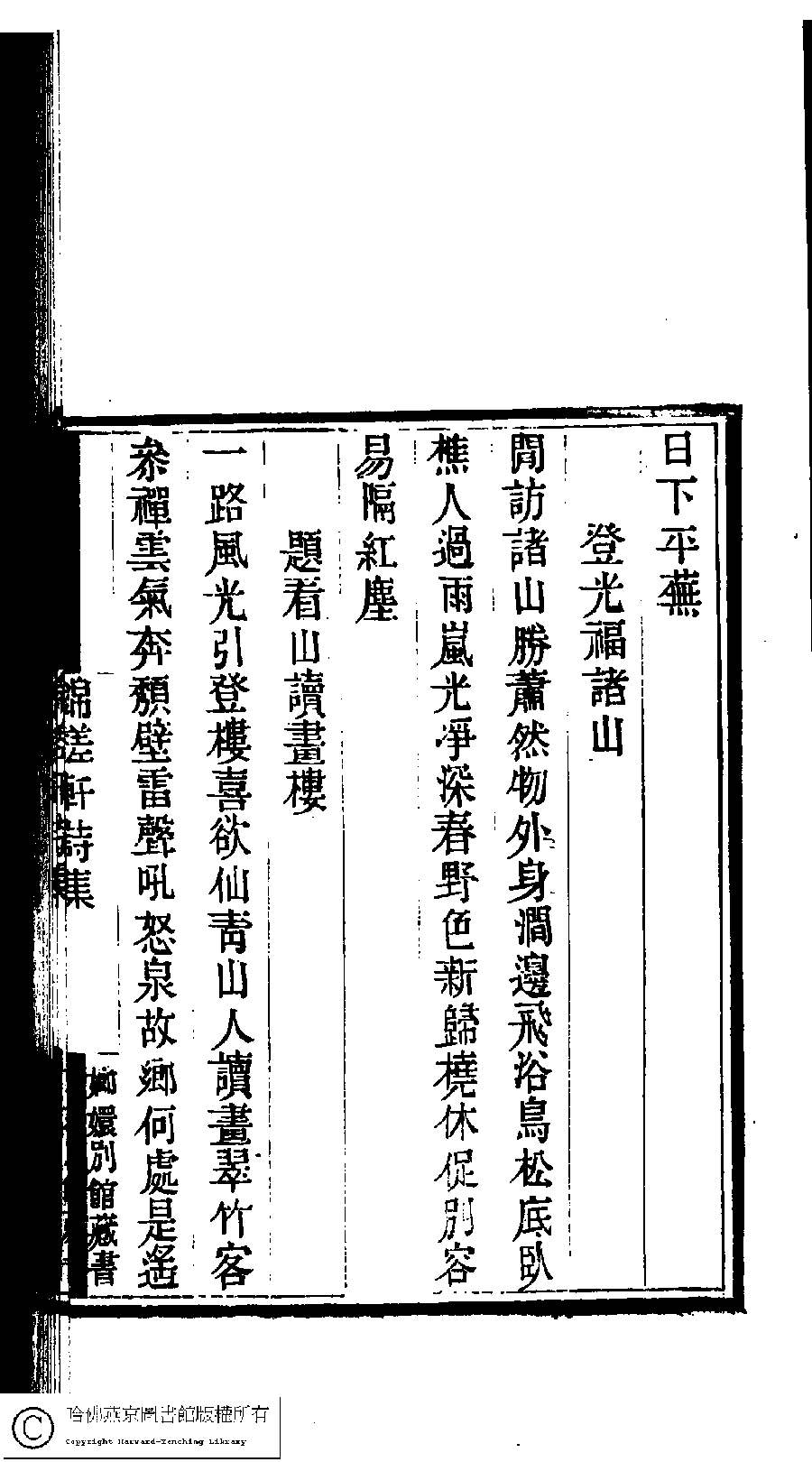 | (PRINT FRIENDLY VERSION) 國朝閨閣詩鈔﹕一百種一百卷(清蔡殿齊輯) : 錦槎軒詩稿﹕一卷。清道光二十四年(1844)刻本。 ![]() Page : 10.14a | click for larger image | Back |
