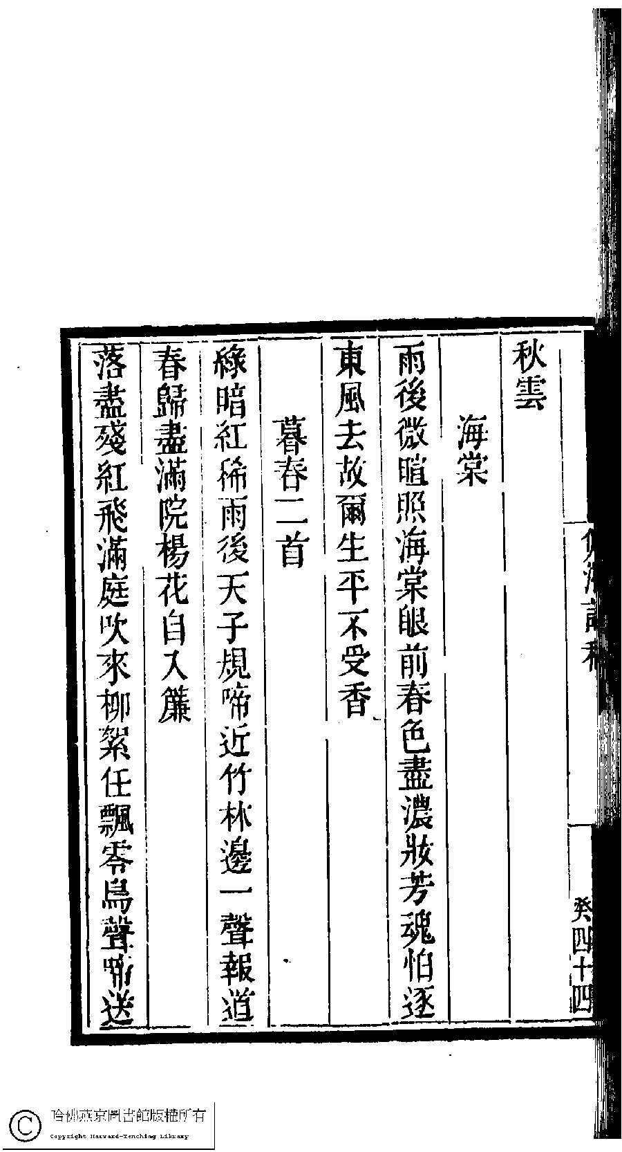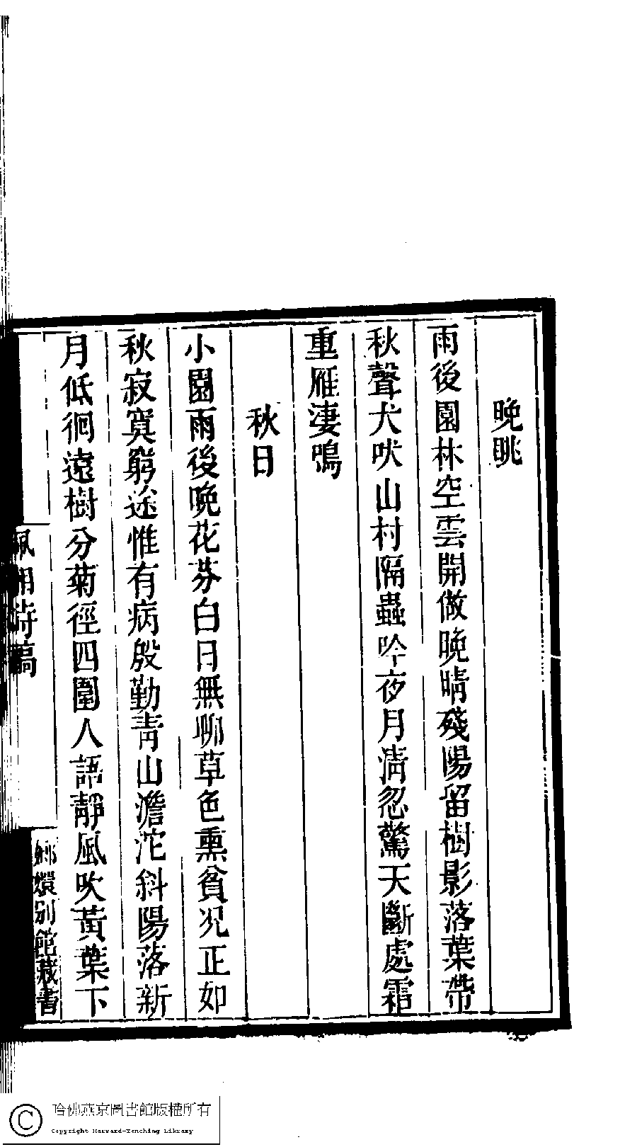 | (PRINT FRIENDLY VERSION) 國朝閨閣詩鈔﹕一百種一百卷(清蔡殿齊輯) : 佩湘詩稿﹕一卷。清道光二十四年(1844)刻本。 ![]() Page : 10.44b | click for larger image | 國朝閨閣詩鈔﹕一百種一百卷(清蔡殿齊輯) : 佩湘詩稿﹕一卷。清道光二十四年(1844)刻本。![]() Page : 10.44a | click for larger image | Back |