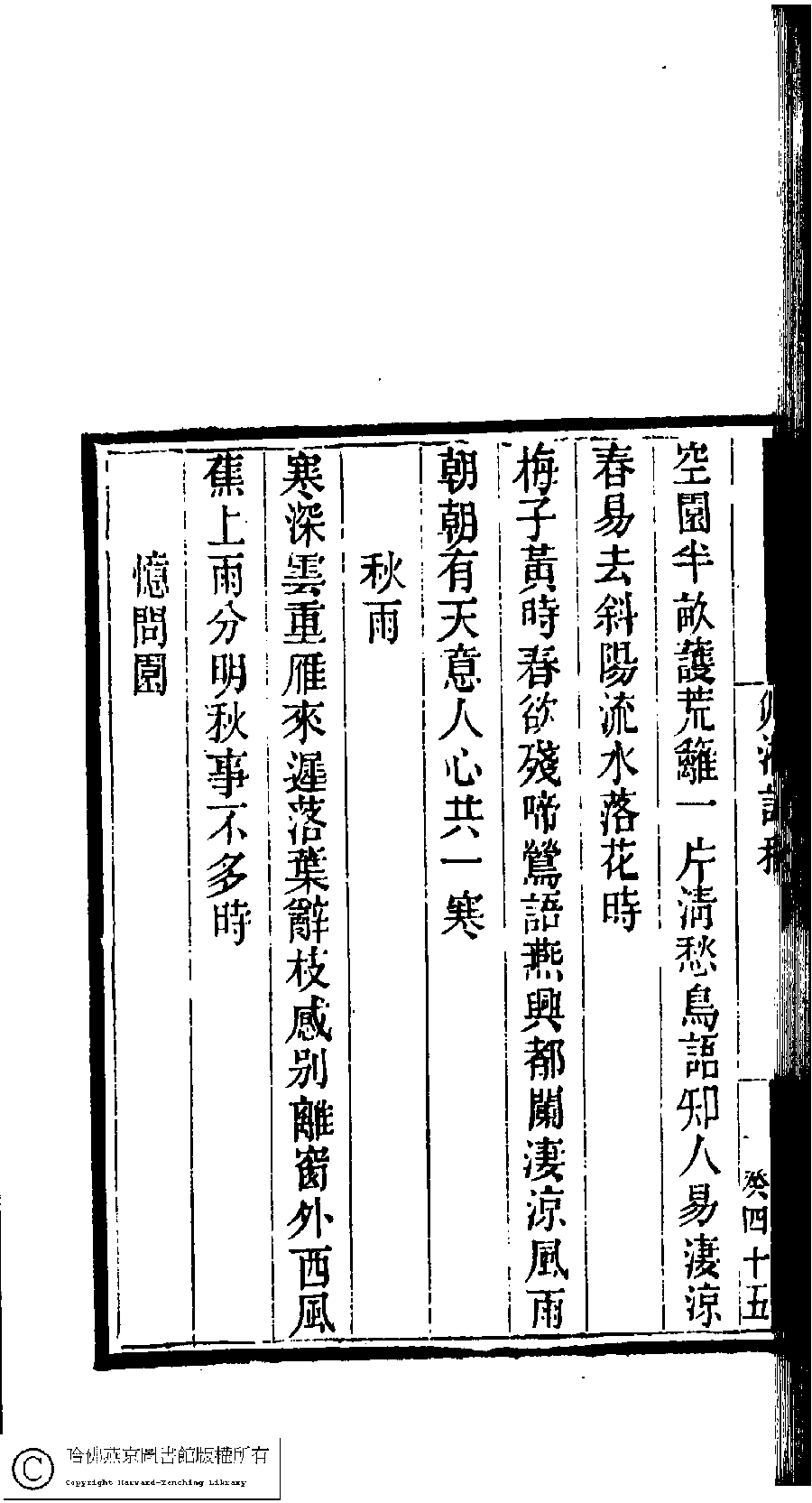 | (PRINT FRIENDLY VERSION) 國朝閨閣詩鈔﹕一百種一百卷(清蔡殿齊輯) : 佩湘詩稿﹕一卷。清道光二十四年(1844)刻本。 ![]() Page : 10.45b | click for larger image | Back |