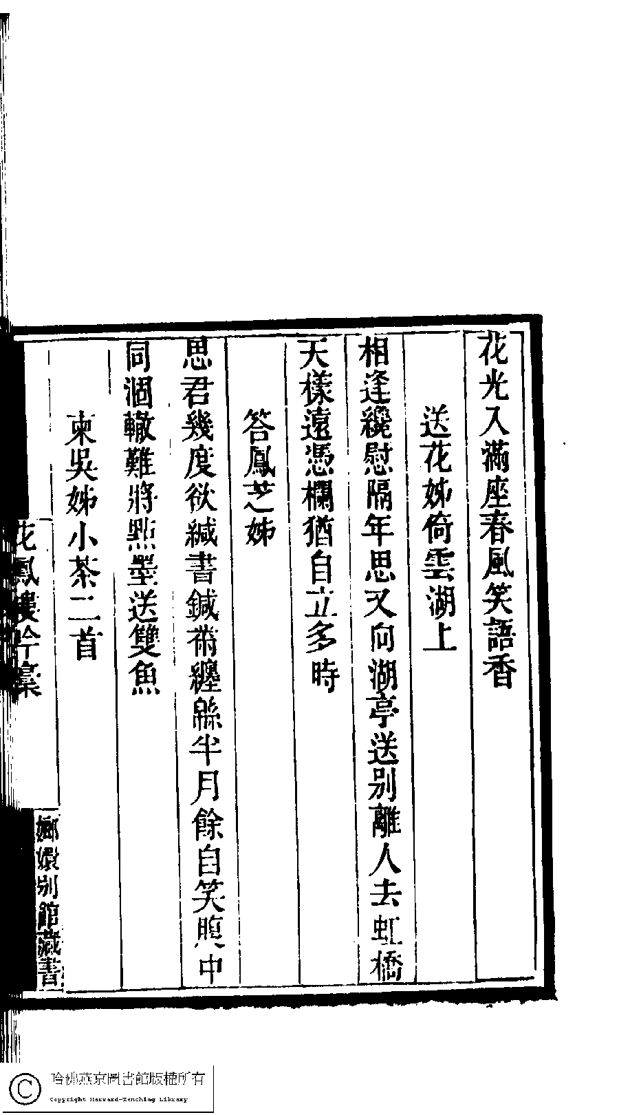 | (PRINT FRIENDLY VERSION) 國朝閨閣詩鈔﹕一百種一百卷(清蔡殿齊輯) : 花鳳樓吟稿﹕一卷。清道光二十四年(1844)刻本。 ![]() Page : 10.56b | click for larger image | 國朝閨閣詩鈔﹕一百種一百卷(清蔡殿齊輯) : 花鳳樓吟稿﹕一卷。清道光二十四年(1844)刻本。![]() Page : 10.56a | click for larger image | Back |