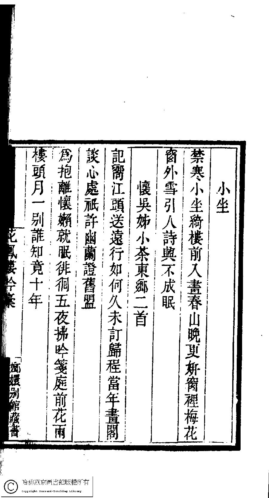 | (PRINT FRIENDLY VERSION) 國朝閨閣詩鈔﹕一百種一百卷(清蔡殿齊輯) : 花鳳樓吟稿﹕一卷。清道光二十四年(1844)刻本。 ![]() Page : 10.60a | click for larger image | Back |