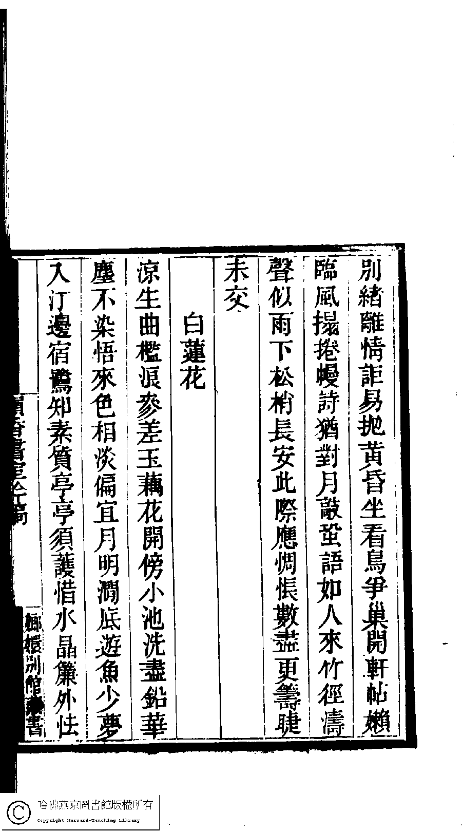 | (PRINT FRIENDLY VERSION) 國朝閨閣詩鈔﹕一百種一百卷(清蔡殿齊輯) : 韻香書室吟稿﹕一卷。清道光二十四年(1844)刻本。 ![]() Page : 10.71b | click for larger image | 國朝閨閣詩鈔﹕一百種一百卷(清蔡殿齊輯) : 韻香書室吟稿﹕一卷。清道光二十四年(1844)刻本。![]() Page : 10.71a | click for larger image | Back |