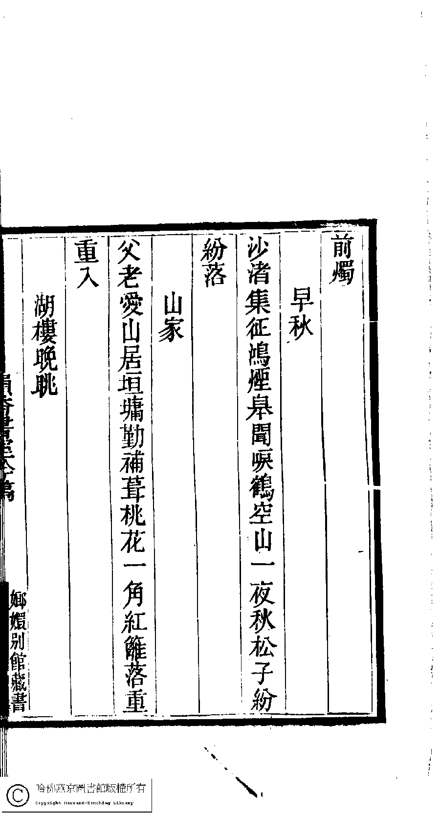 | (PRINT FRIENDLY VERSION) 國朝閨閣詩鈔﹕一百種一百卷(清蔡殿齊輯) : 韻香書室吟稿﹕一卷。清道光二十四年(1844)刻本。 ![]() Page : 10.75a | click for larger image | Back |