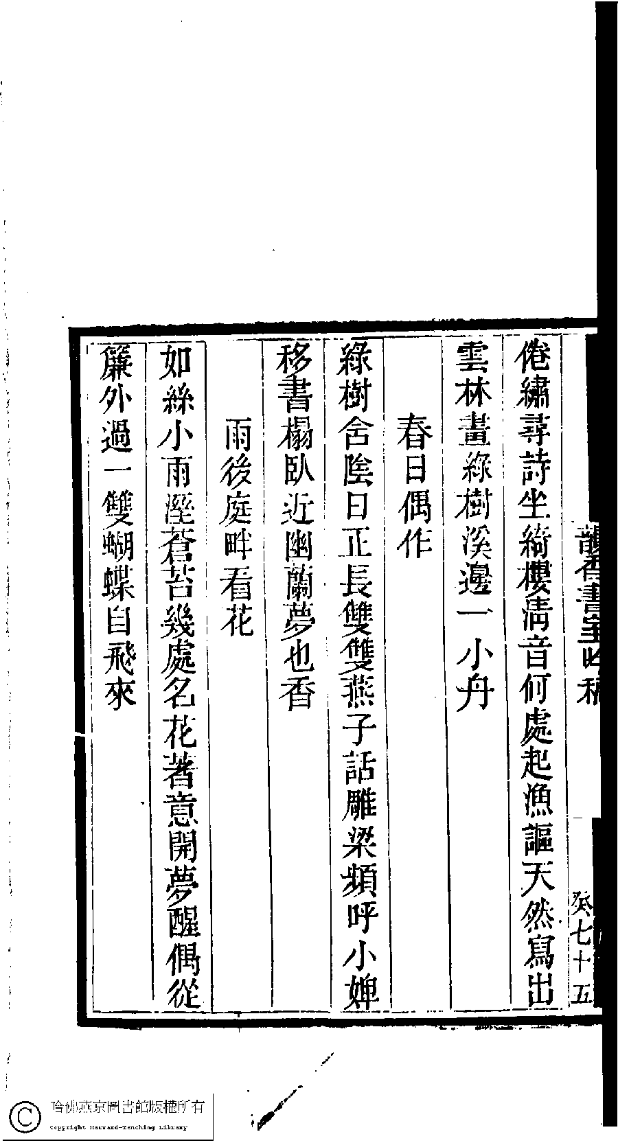 | (PRINT FRIENDLY VERSION) 國朝閨閣詩鈔﹕一百種一百卷(清蔡殿齊輯) : 韻香書室吟稿﹕一卷。清道光二十四年(1844)刻本。 ![]() Page : 10.75b | click for larger image | Back |