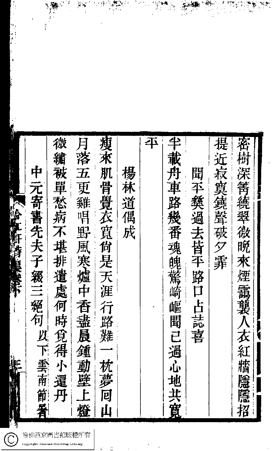 | (PRINT FRIENDLY VERSION) 冷紅軒詩集﹕二卷﹐附詞(清百保友蘭撰)。清光緒元年(1875)刻本。 ![]() Page : 下.3a | click for larger image | 冷紅軒詩集﹕二卷﹐附詞(清百保友蘭撰)。清光緒元年(1875)刻本。![]() Page : 下.2b | click for larger image | Back |