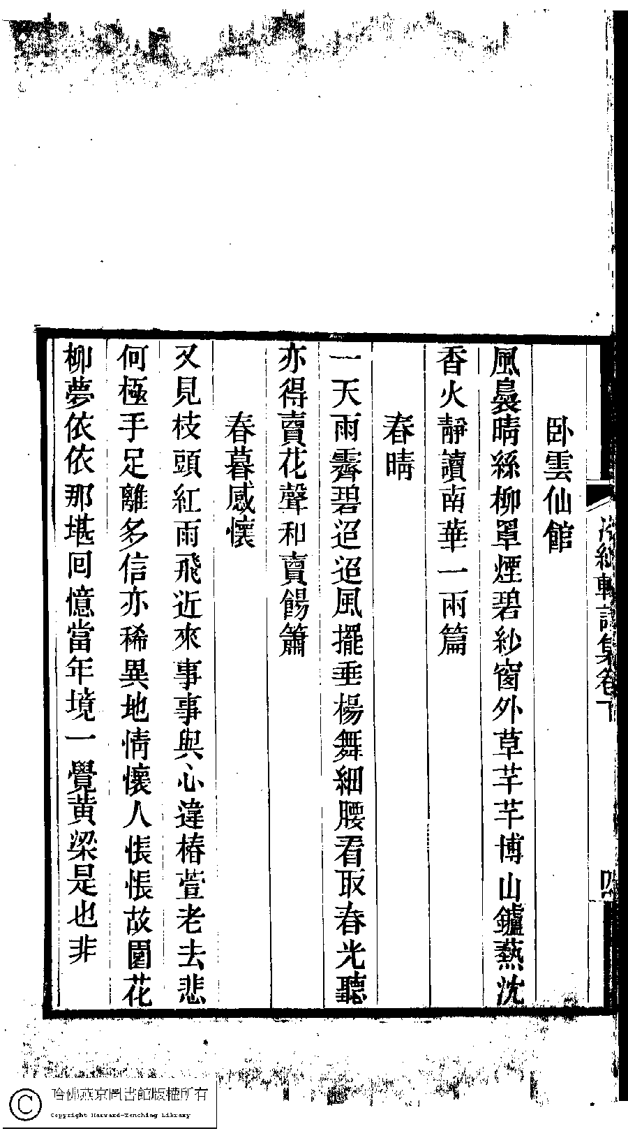 | (PRINT FRIENDLY VERSION) 冷紅軒詩集﹕二卷﹐附詞(清百保友蘭撰)。清光緒元年(1875)刻本。 ![]() Page : 下.4b | click for larger image | Back |